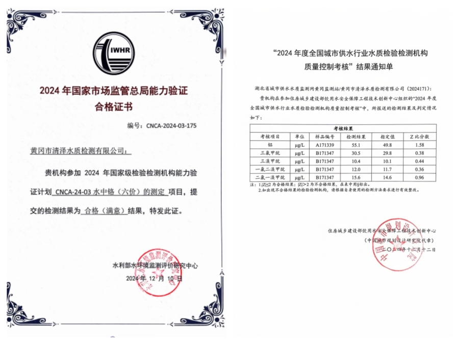 2024年12月10日,黃岡市清澤水質(zhì)檢測(cè)有限公司收到國(guó)家市場(chǎng)監(jiān)管總局2024年度國(guó)家級(jí)檢驗(yàn)檢測(cè)機(jī)構(gòu)能力驗(yàn)證結(jié)果的通知;2024年12月21日,黃岡市清澤水質(zhì)檢測(cè)有限公司收到住建部2024年度全國(guó)城市供水行業(yè)水質(zhì)檢驗(yàn)檢測(cè)機(jī)構(gòu)質(zhì)量考核結(jié)果通過(guò)的通知。