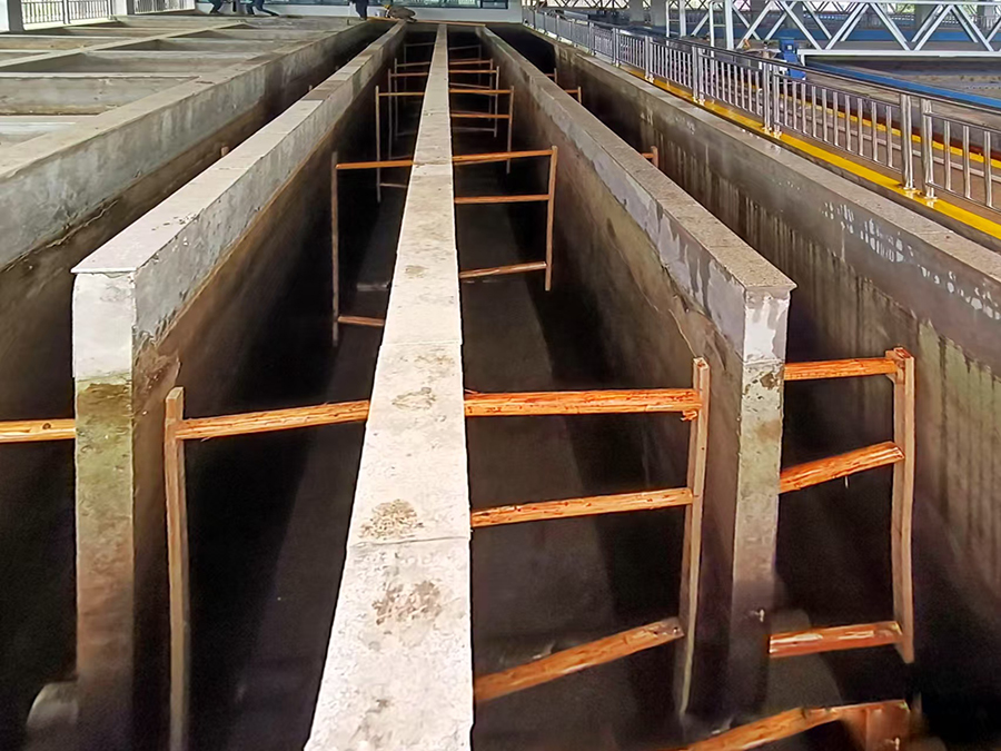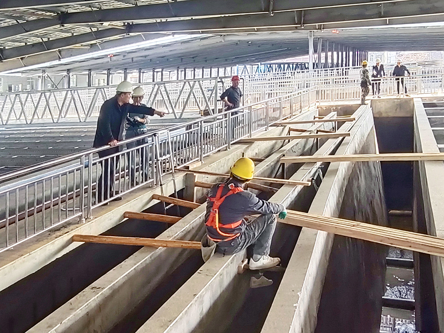 在此危急時刻,公司分管投資基建副經理劉廣第一時間組織三水廠、建設和資產管理部、生產管理中心等部門負責人、技術人員到達現(xiàn)場診斷。確定是池底泥沙不均勻沉積,形成“隱形斜坡”,致使墻體受力失衡。“這就像在蹺蹺板下墊了塊石頭,必須標本兼治。”劉廣一針見血指出問題關鍵。若采用傳統(tǒng)的拆除重建方案,不僅需耗資50萬元,更將導致局部停產,嚴重影響供水穩(wěn)定。