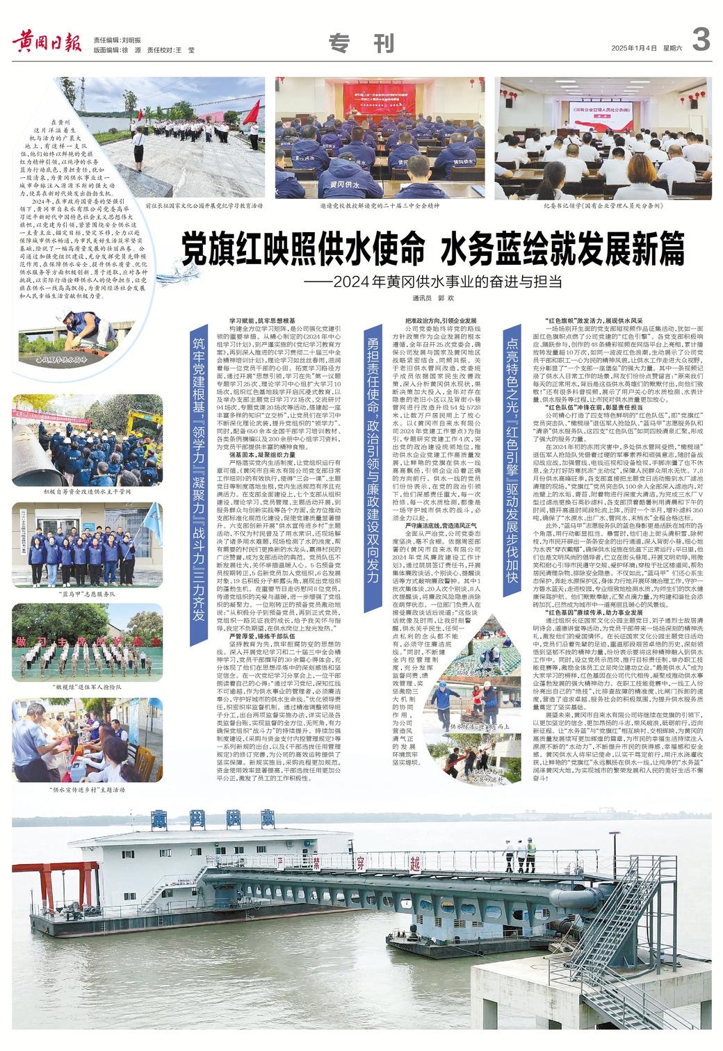 2024年,在市政府國資委的堅強引領(lǐng)下,黃岡市自來水有限公司黨委高舉習(xí)近平新時代中國特色社會主義思想偉大旗幟,以黨建為引領(lǐng),緊緊圍繞安全供水這一主責主業(yè),錨定目標,堅定不移,全力以赴保障城市供水暢通,為市民美好生活筑牢堅實基礎(chǔ),繪就了一幅高質(zhì)量發(fā)展的壯麗畫卷。公司通過加強黨組織建設(shè),充分發(fā)揮黨員先鋒模范作用,在保障供水安全、提升供水質(zhì)量、優(yōu)化供水服務(wù)等方面積極創(chuàng)新、勇于進取,應(yīng)對各種挑戰(zhàn),以實際行動詮釋供水人的使命擔當,讓黨旗在供水一線高高飄揚,為黃岡經(jīng)濟社會發(fā)展和人民幸福生活貢獻積極力量。