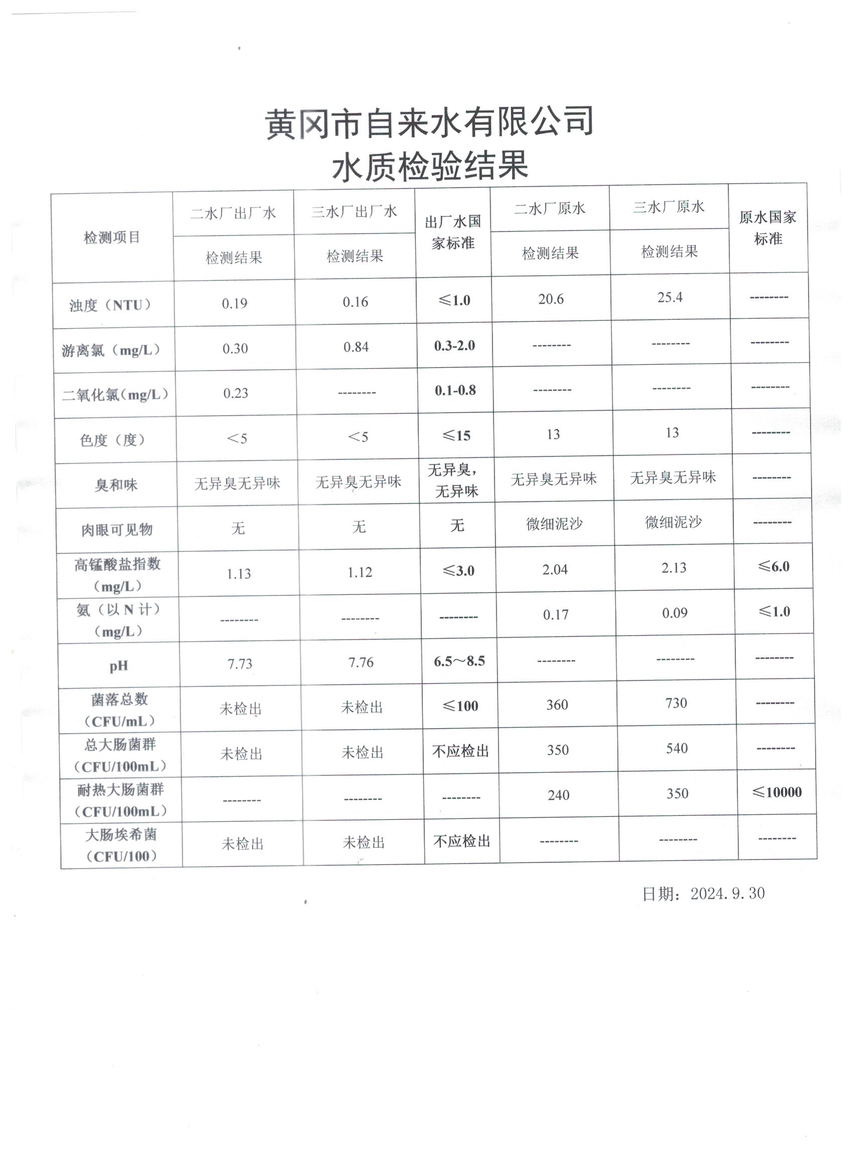 2024年9月30日水質(zhì)檢測(cè)日?qǐng)?bào)表