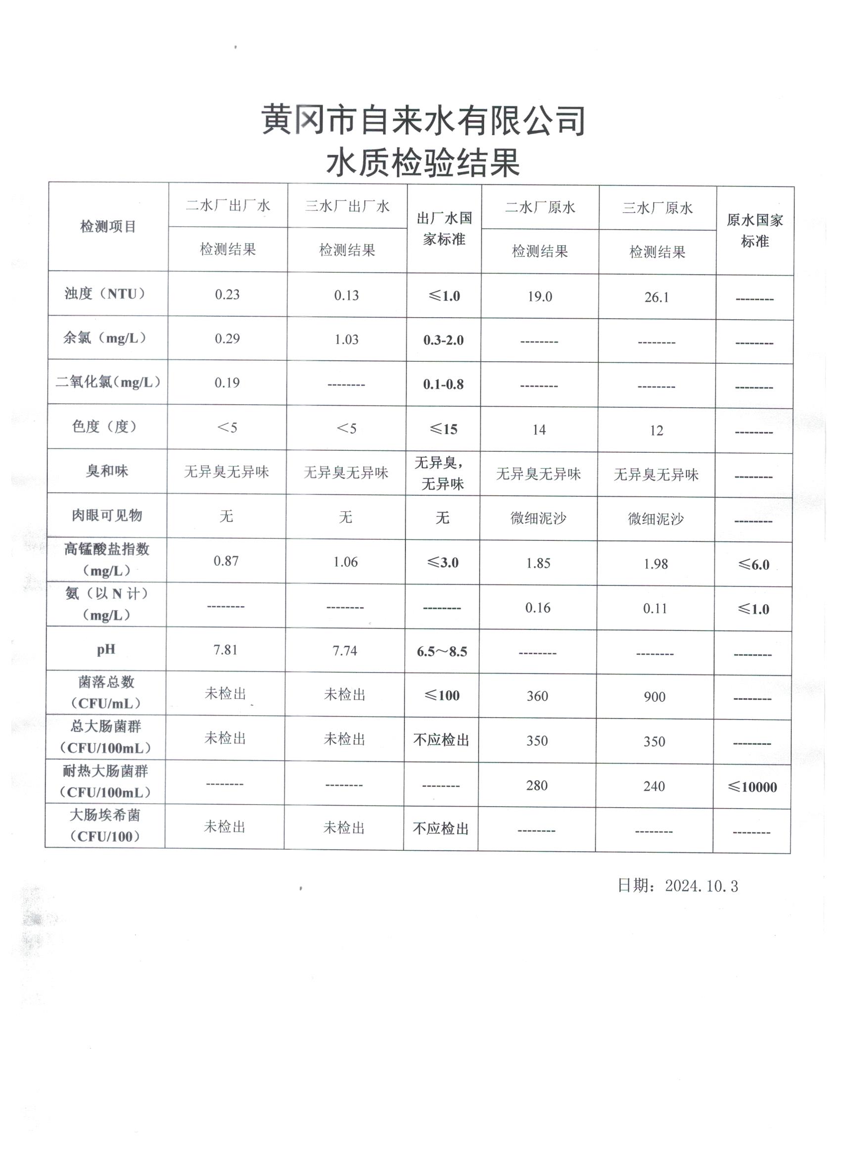 2024年10月3日水質(zhì)檢測日報表