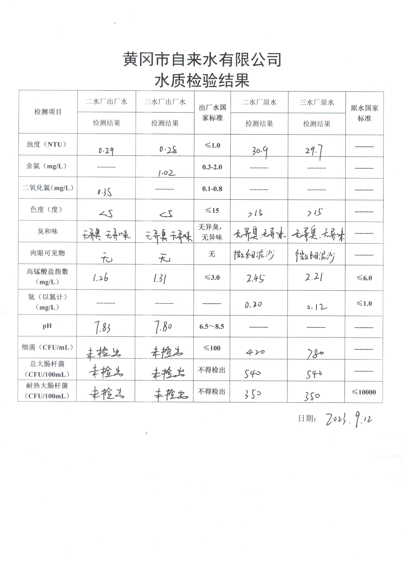 2023年9月12日水質(zhì)檢測(cè)日?qǐng)?bào)表