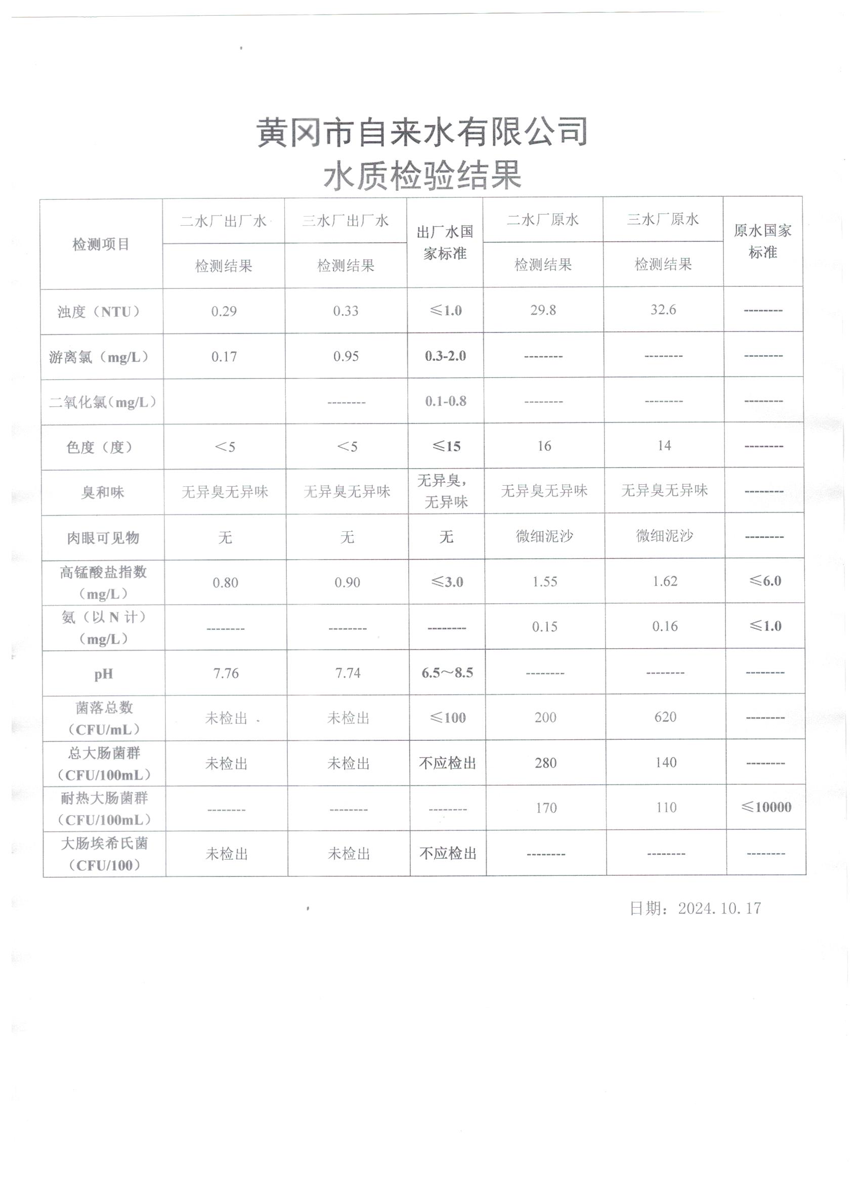 2024年10月17日水質(zhì)檢測(cè)日?qǐng)?bào)表