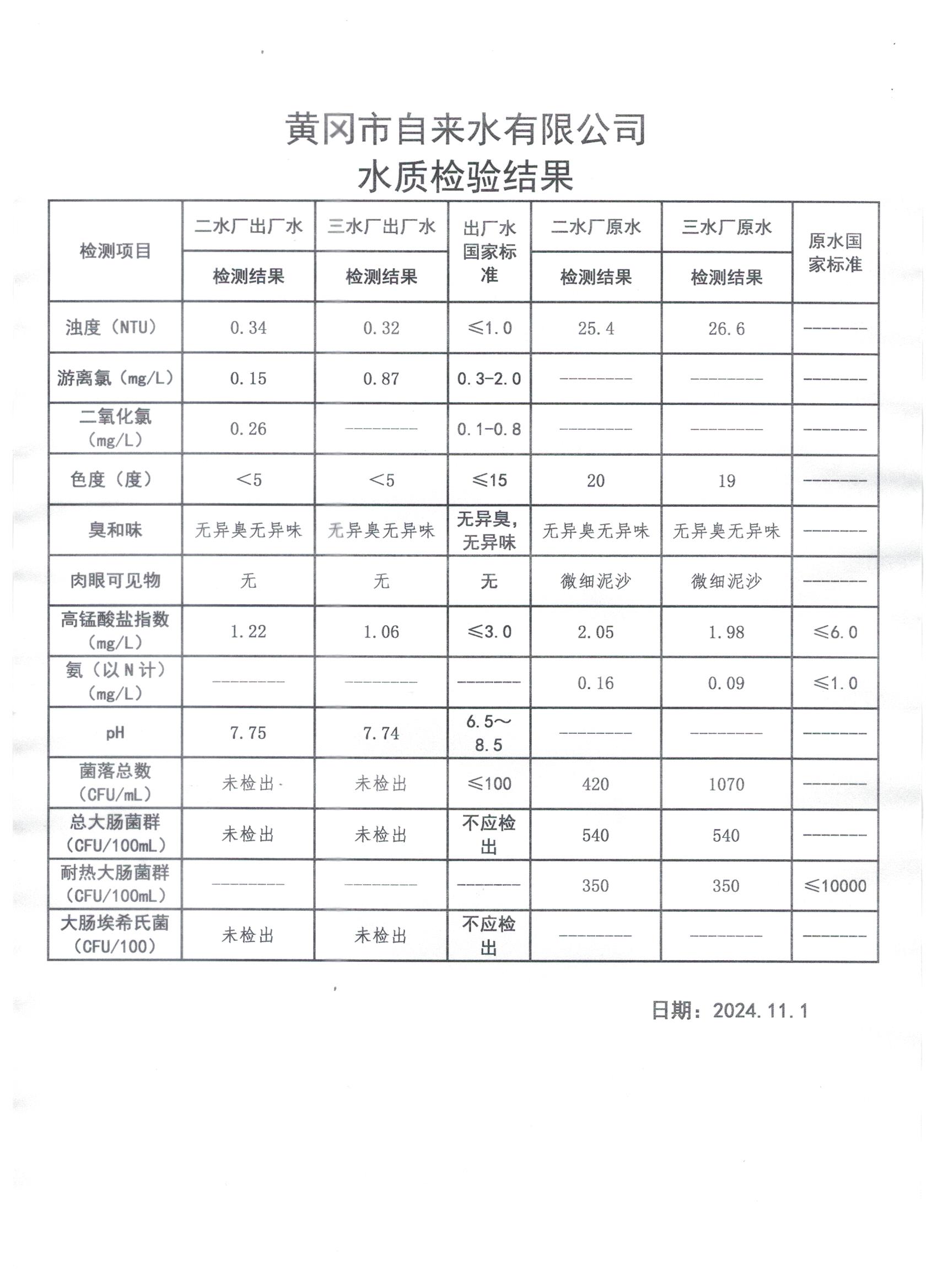2024年11月1日水質(zhì)檢測日報(bào)表