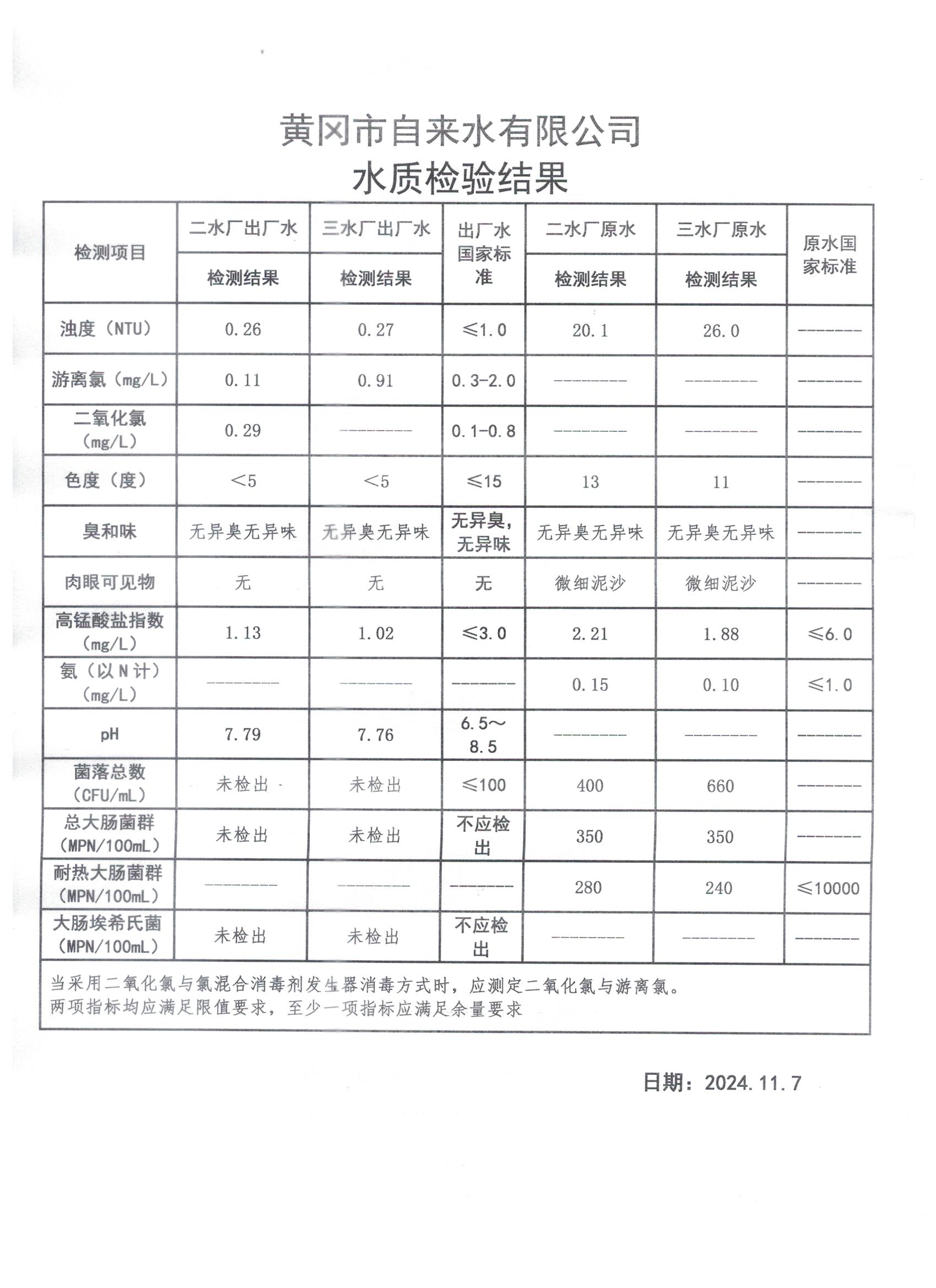 2024年11月7日水質(zhì)檢測日報表