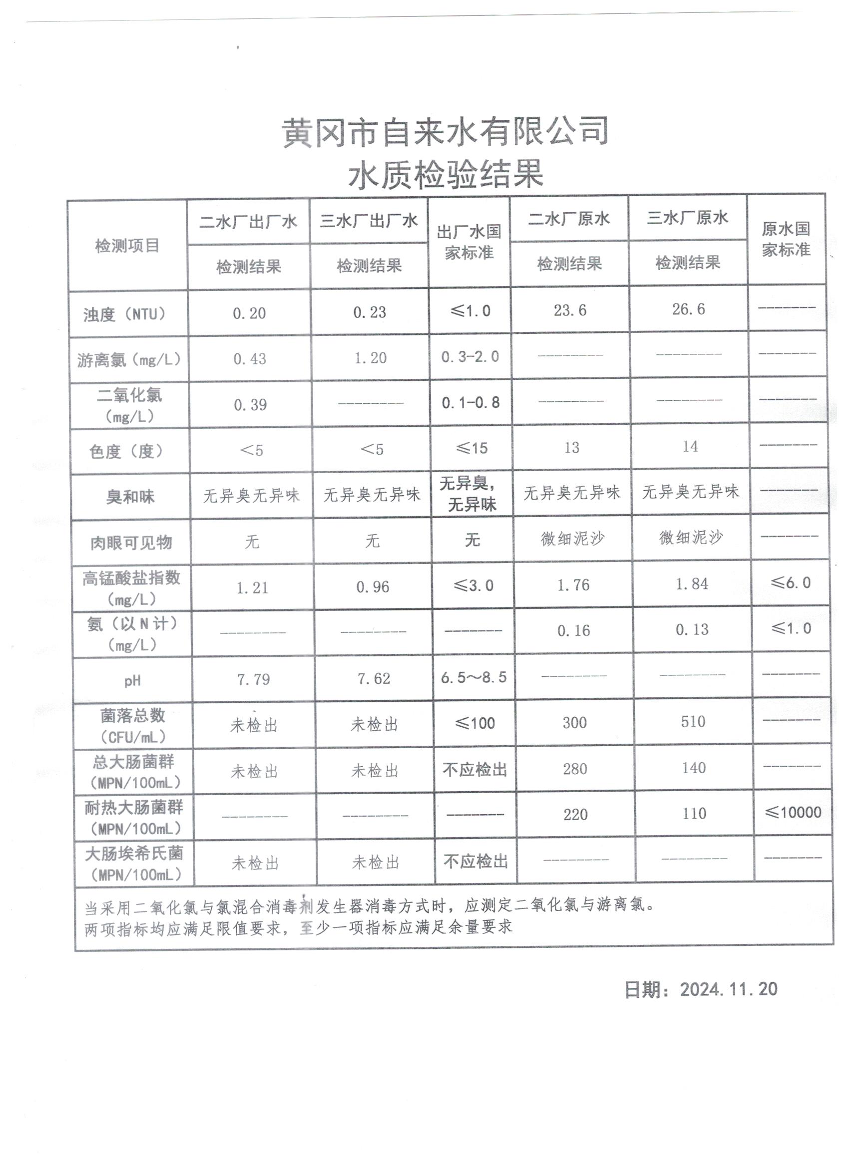 2024年11月20日水質(zhì)檢測(cè)日?qǐng)?bào)表