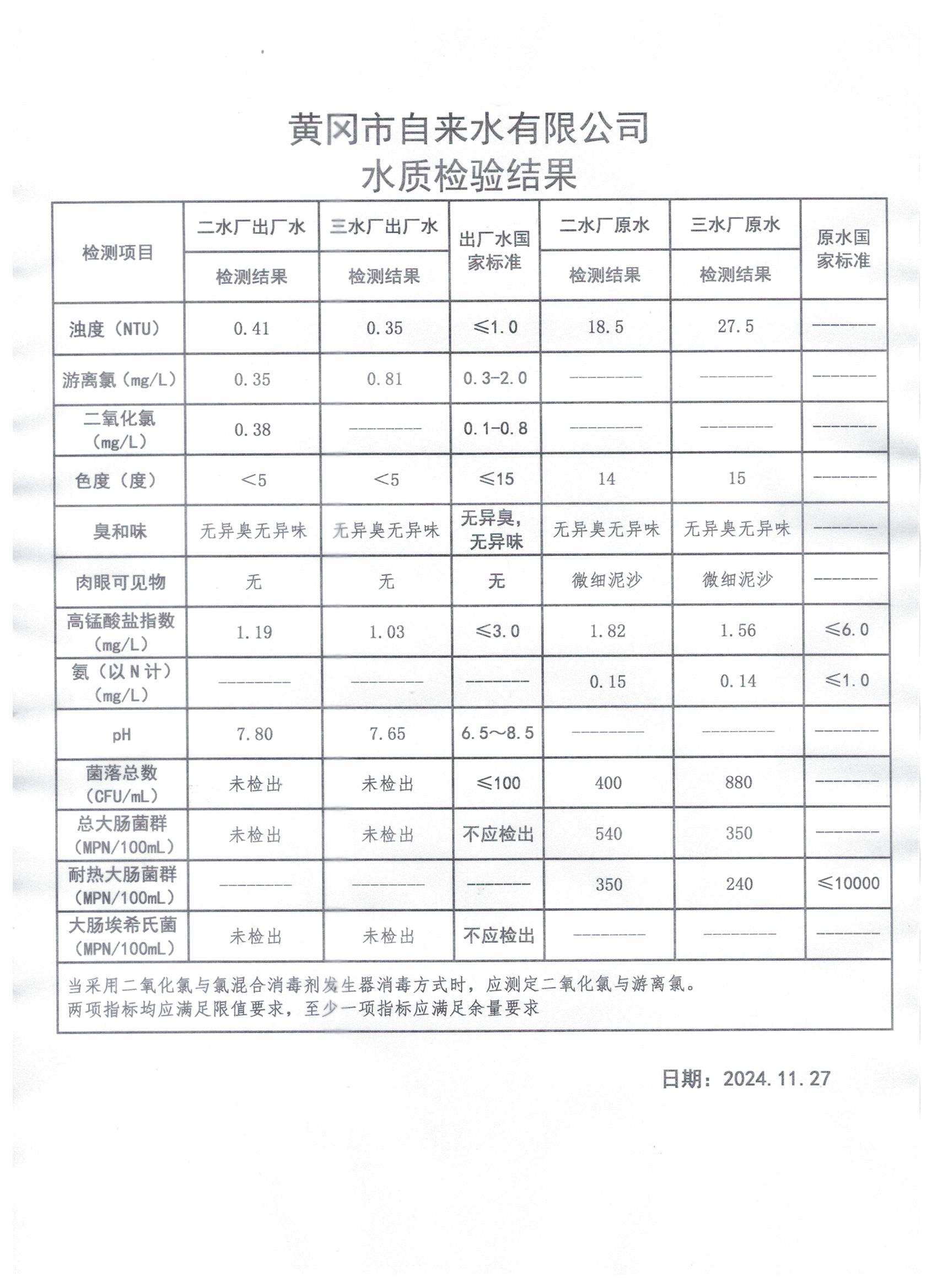 2024年11月27日水質(zhì)檢測日報表