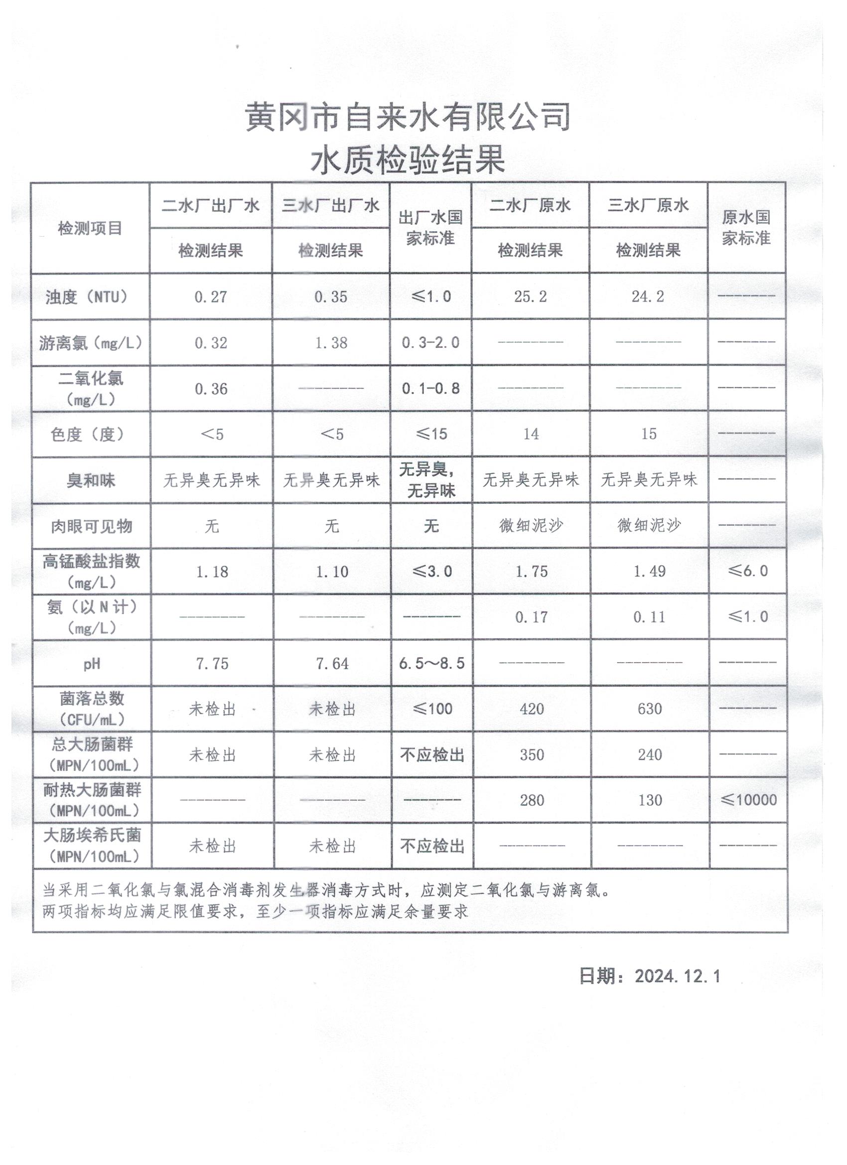 2024年12月1日水質(zhì)檢測日報(bào)表