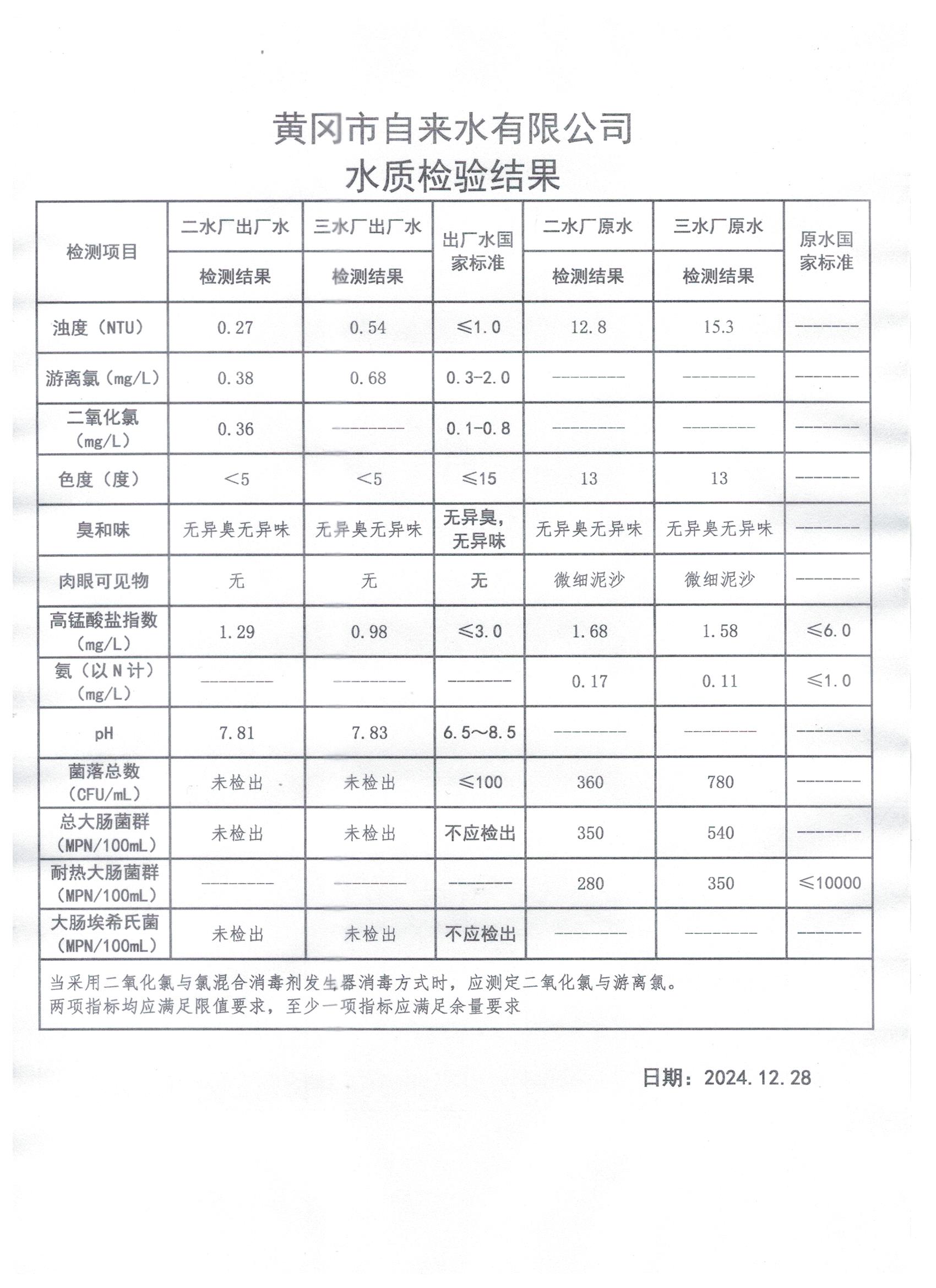 2024年12月28日水質(zhì)檢測日報表