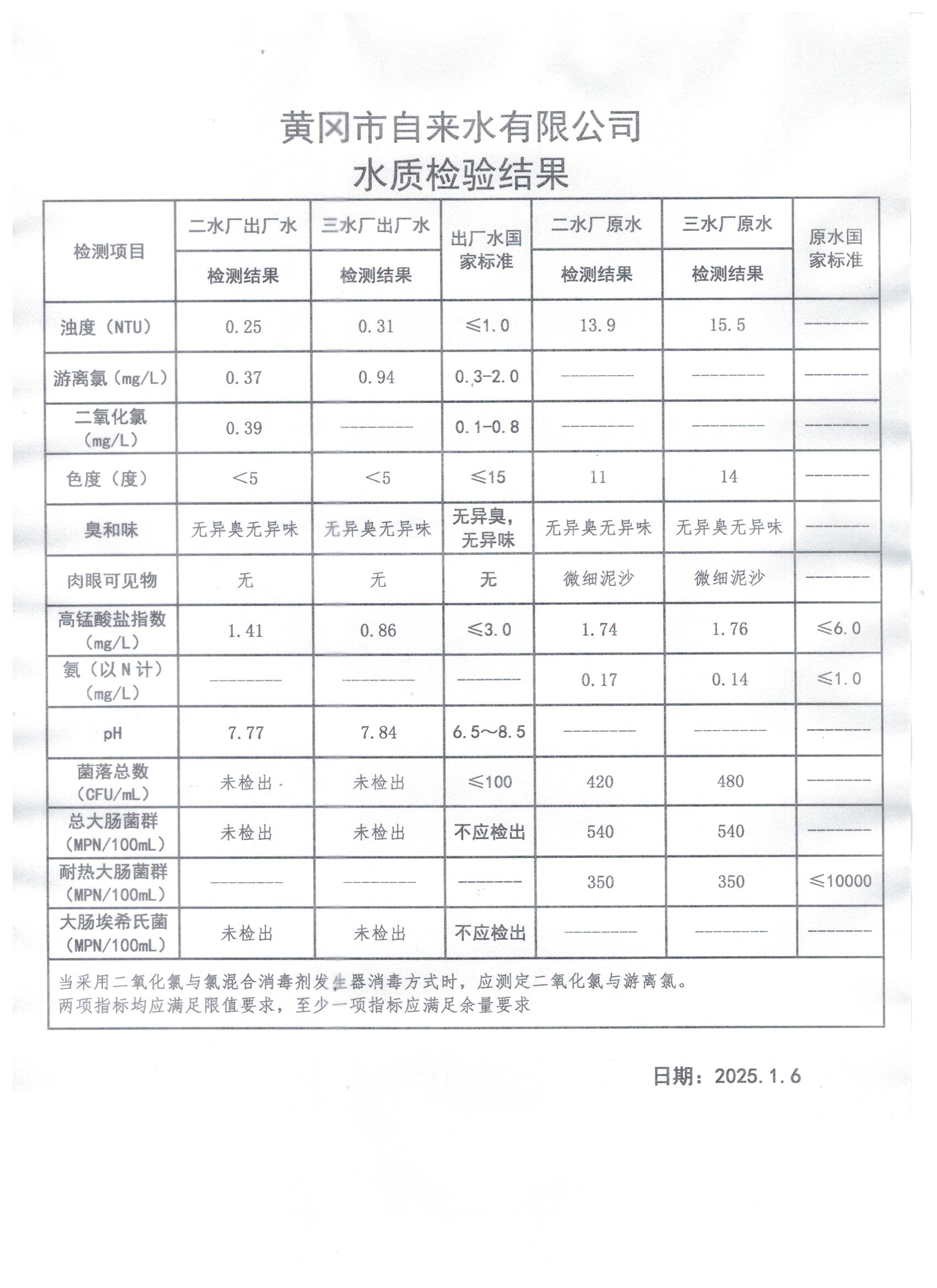 2025年1月6日水質(zhì)檢測(cè)日?qǐng)?bào)表