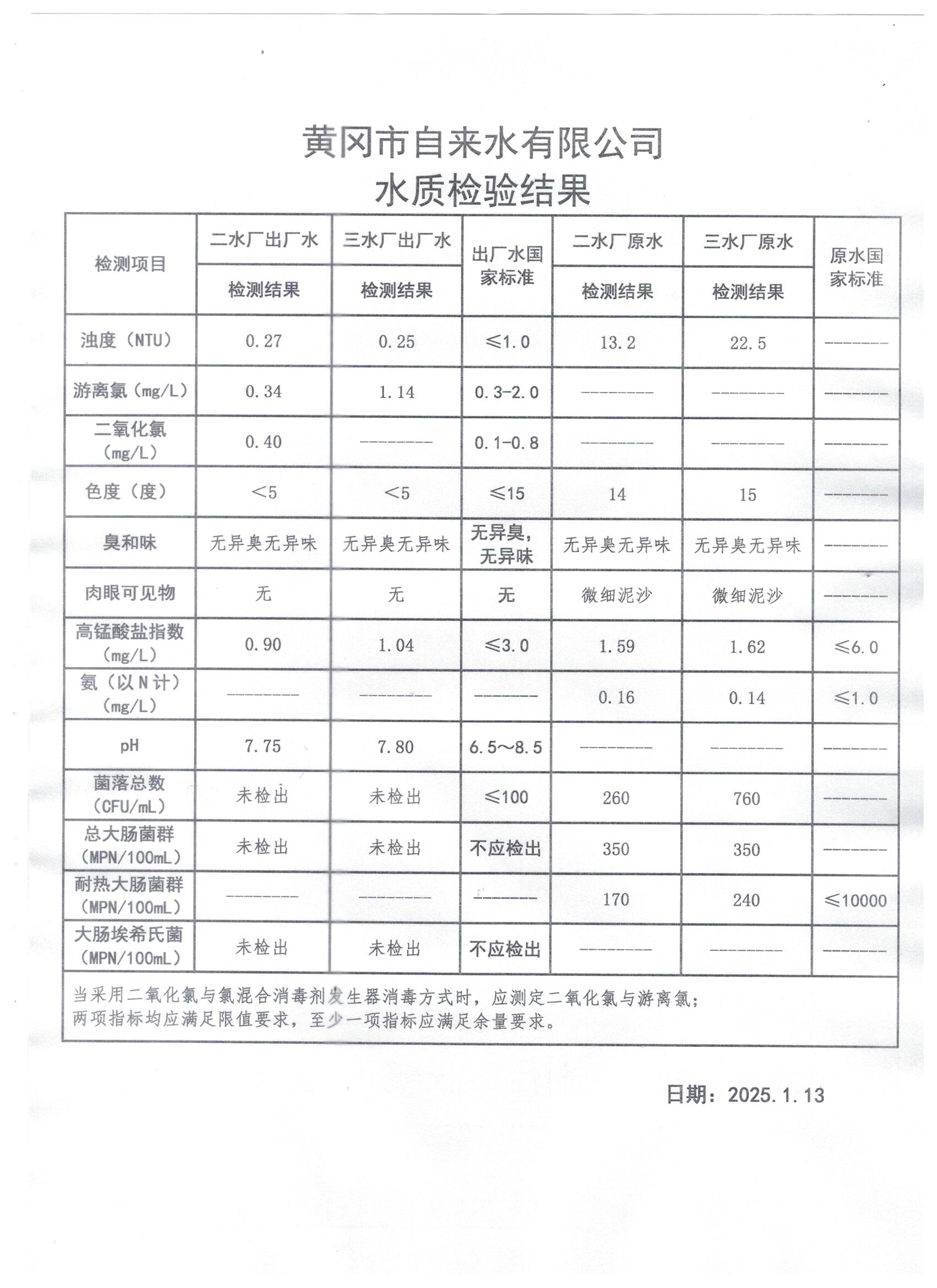 2025年1月13日水質(zhì)檢測(cè)日?qǐng)?bào)表