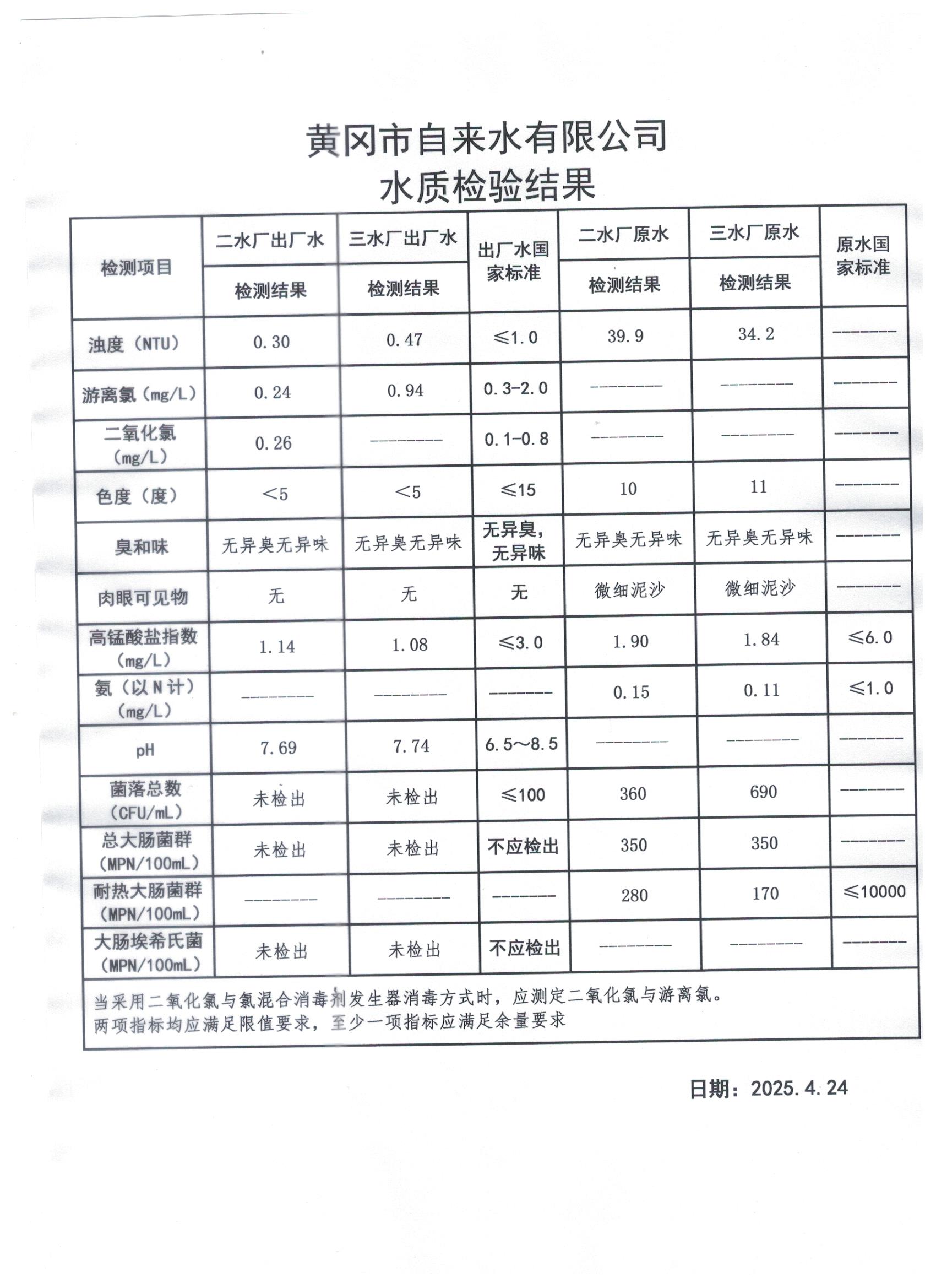 2025年4月24日水質(zhì)檢測日報表