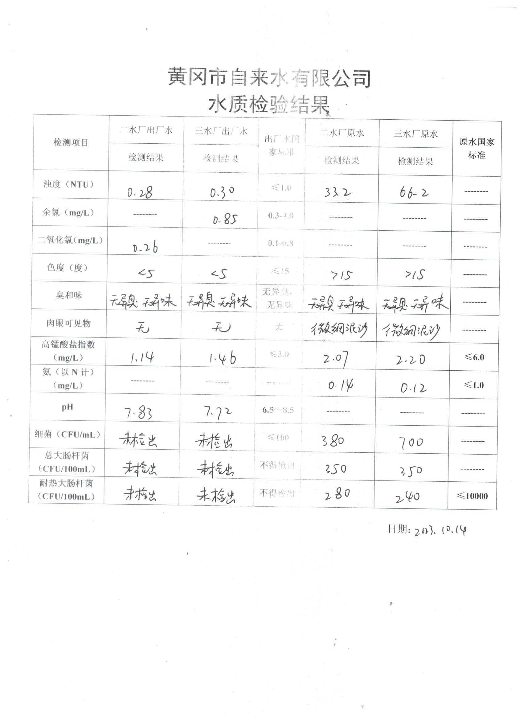 2023年10月14日水質(zhì)檢驗日報表