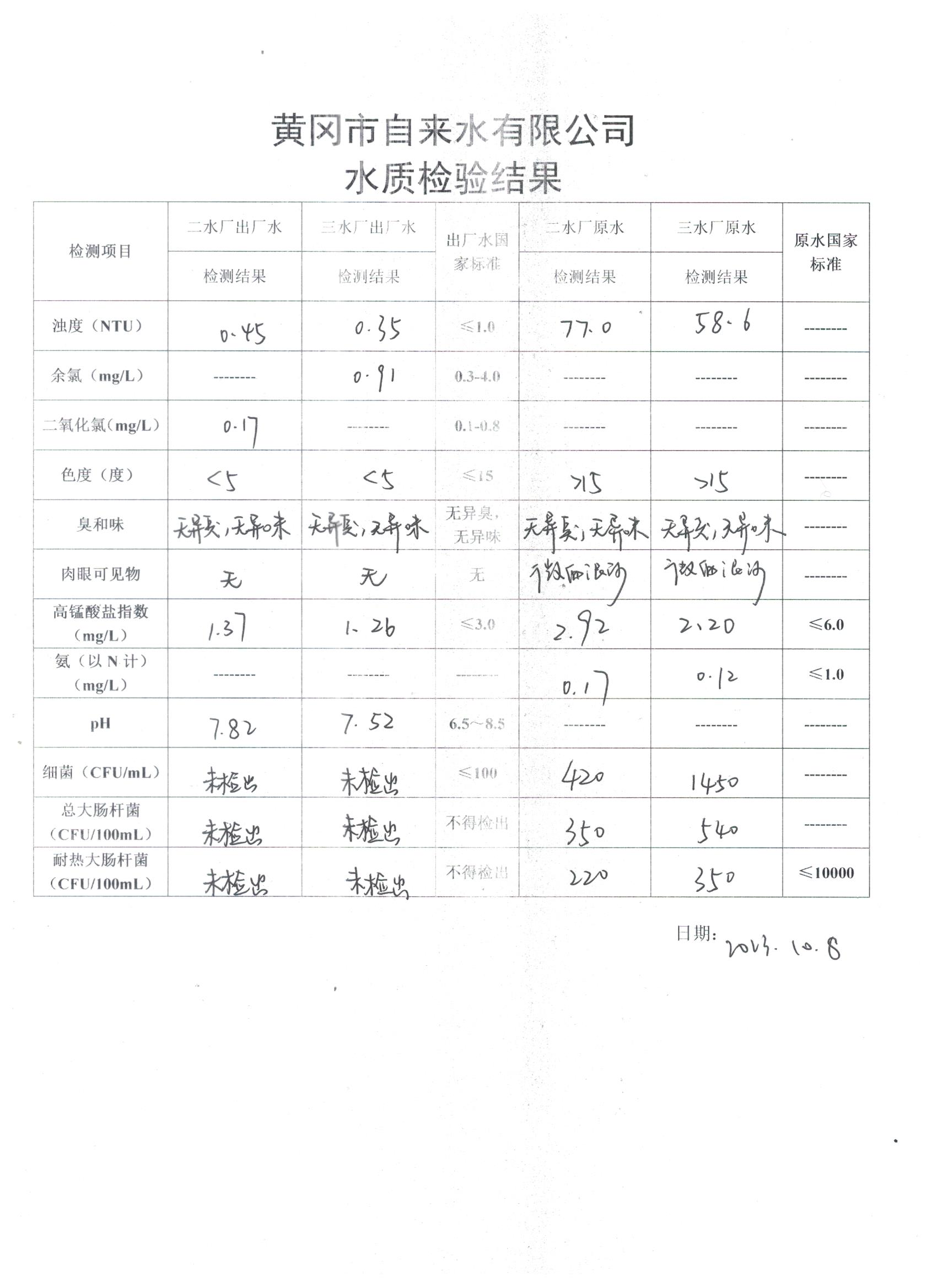 2023年10月8日水質(zhì)檢驗(yàn)日?qǐng)?bào)表