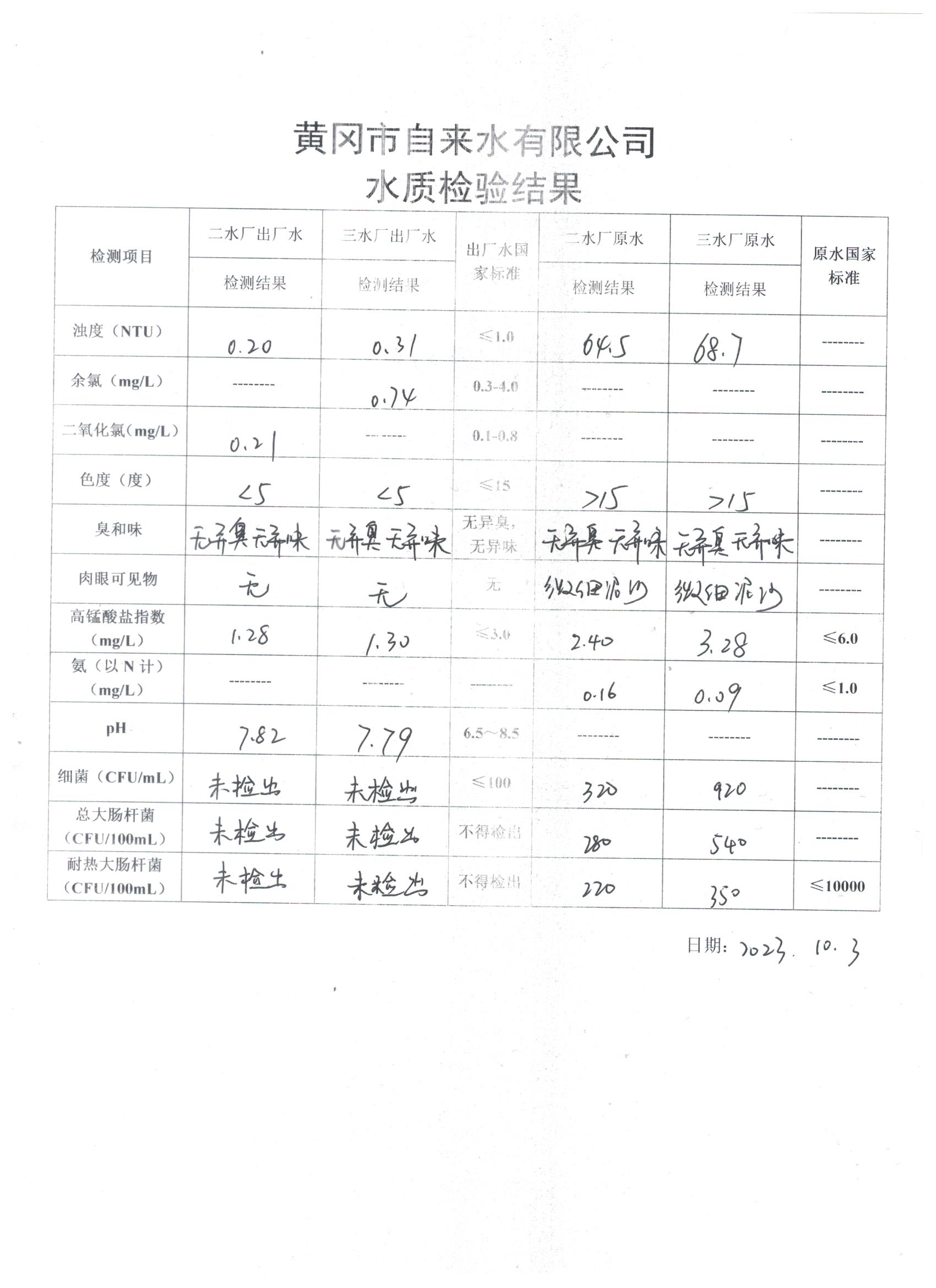 2023年10月3日水質(zhì)檢驗(yàn)日?qǐng)?bào)表