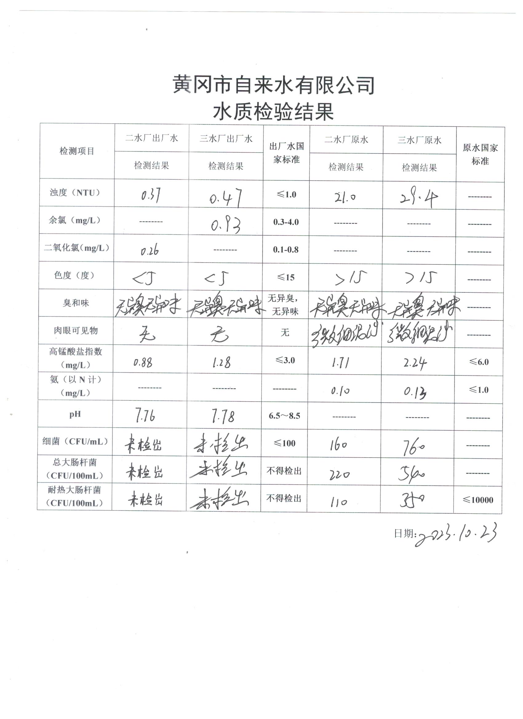 2023年10月23日水質(zhì)檢驗(yàn)日?qǐng)?bào)表