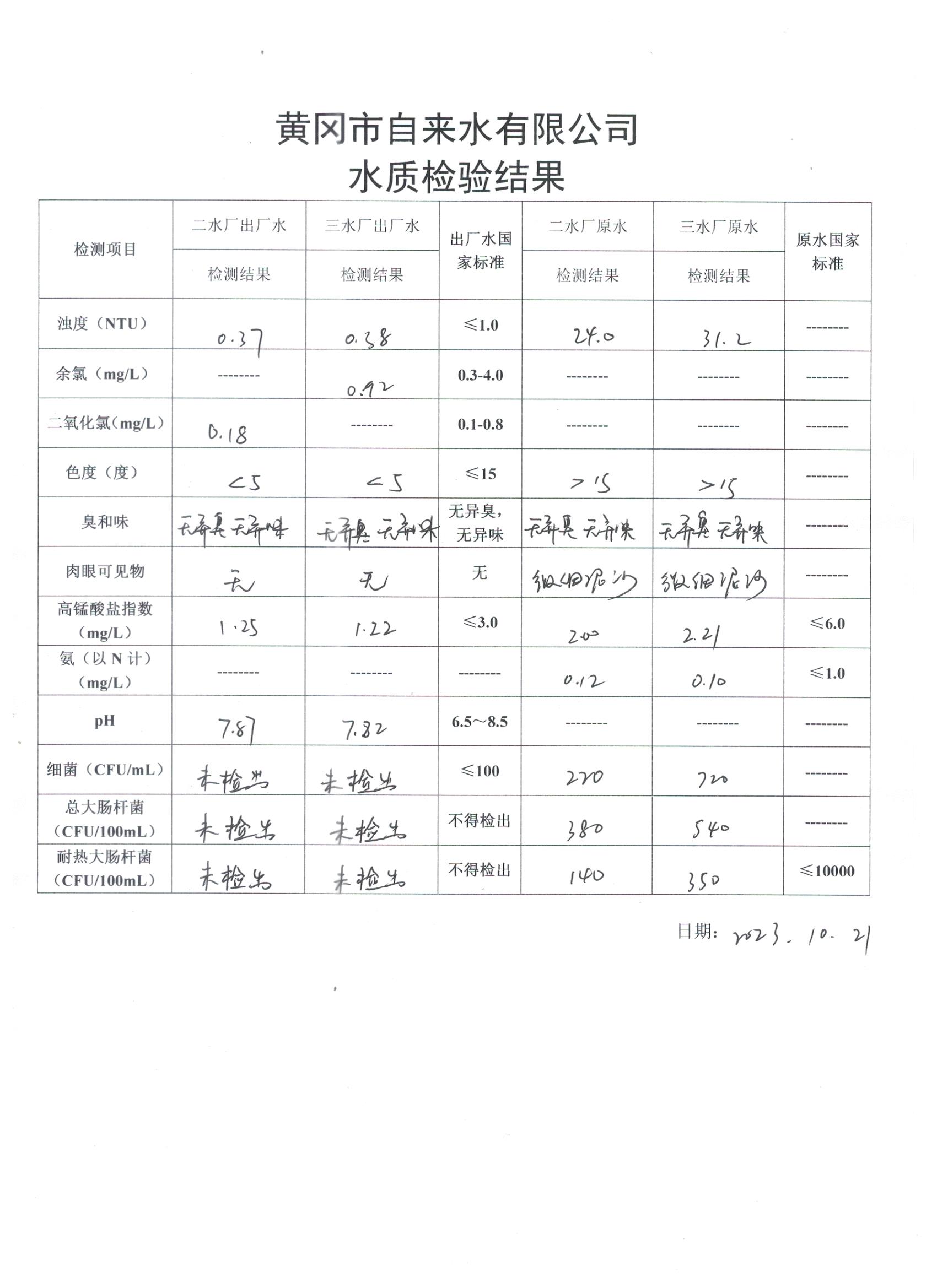 2023年10月21日水質(zhì)檢驗(yàn)日?qǐng)?bào)表