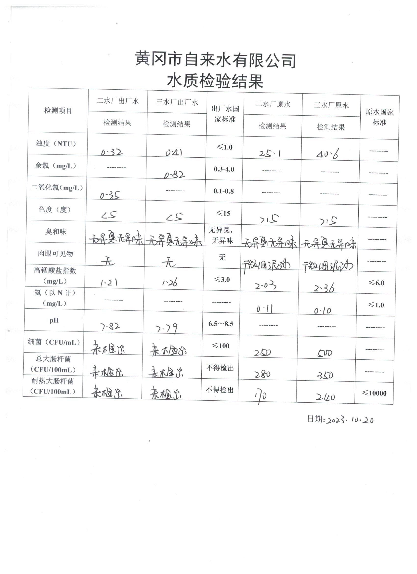 2023年10月20日水質(zhì)檢驗(yàn)日?qǐng)?bào)表