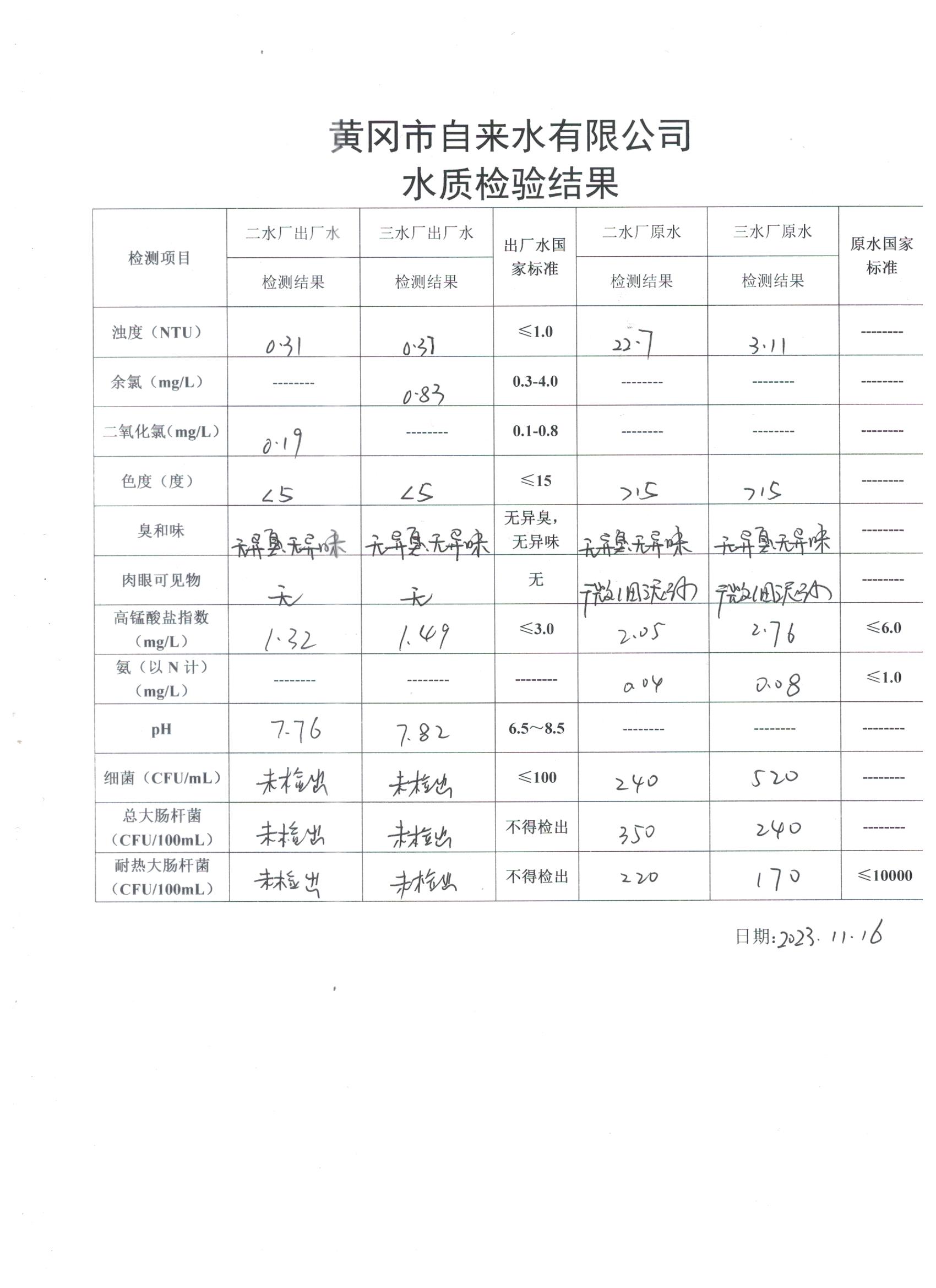 2023年11月16日水質檢驗日報表