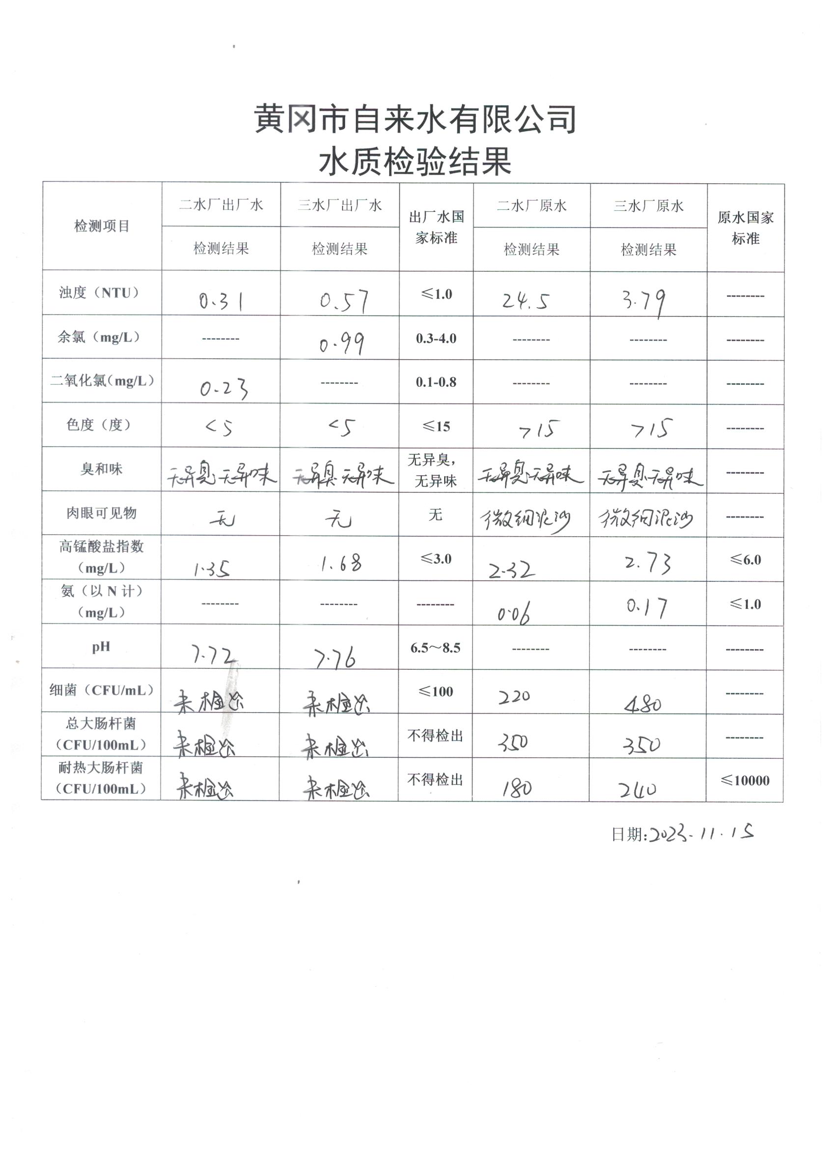 2023年11月15日水質(zhì)檢驗(yàn)日?qǐng)?bào)表