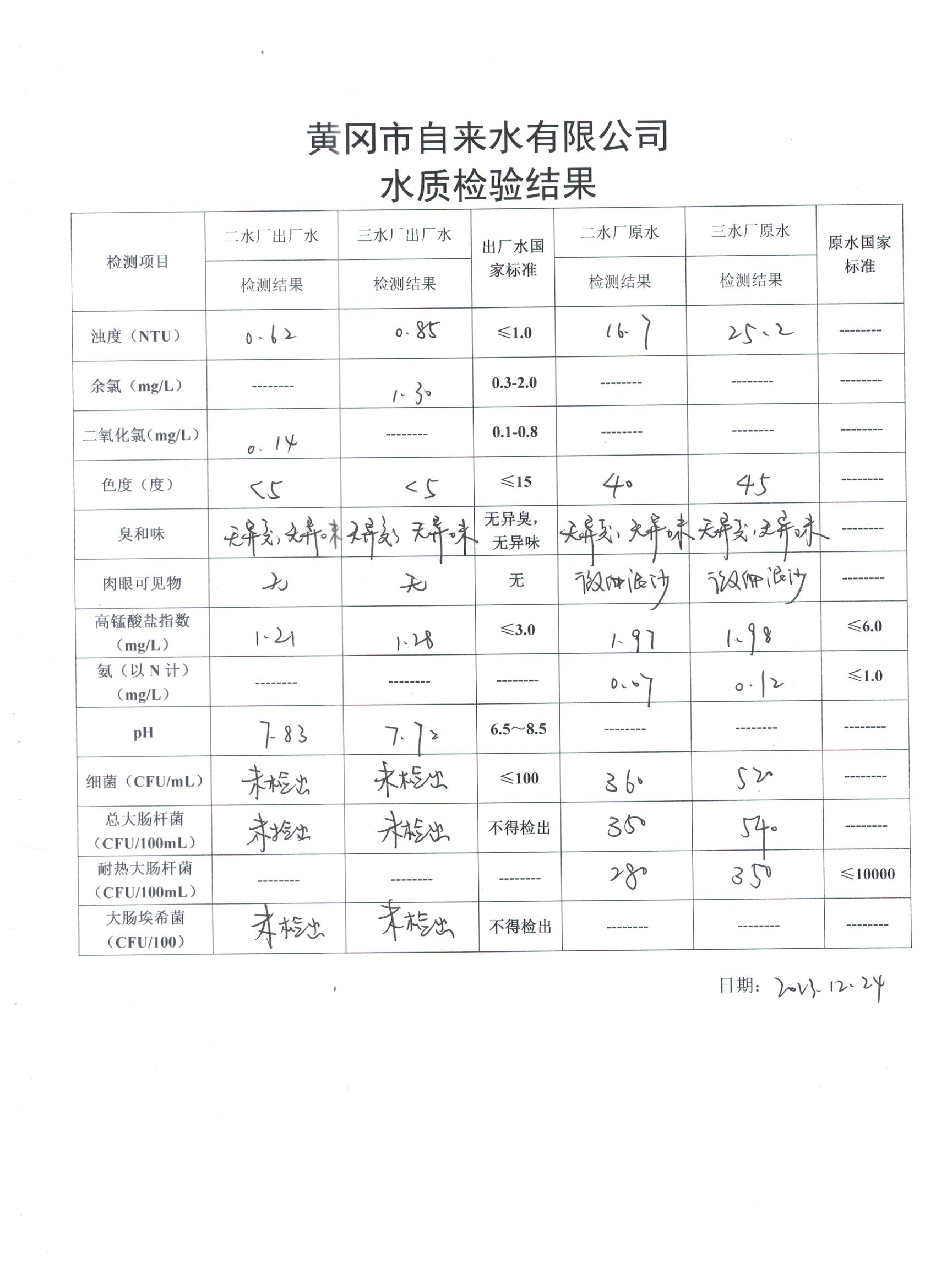 2023年12月24日水質(zhì)檢驗日報表