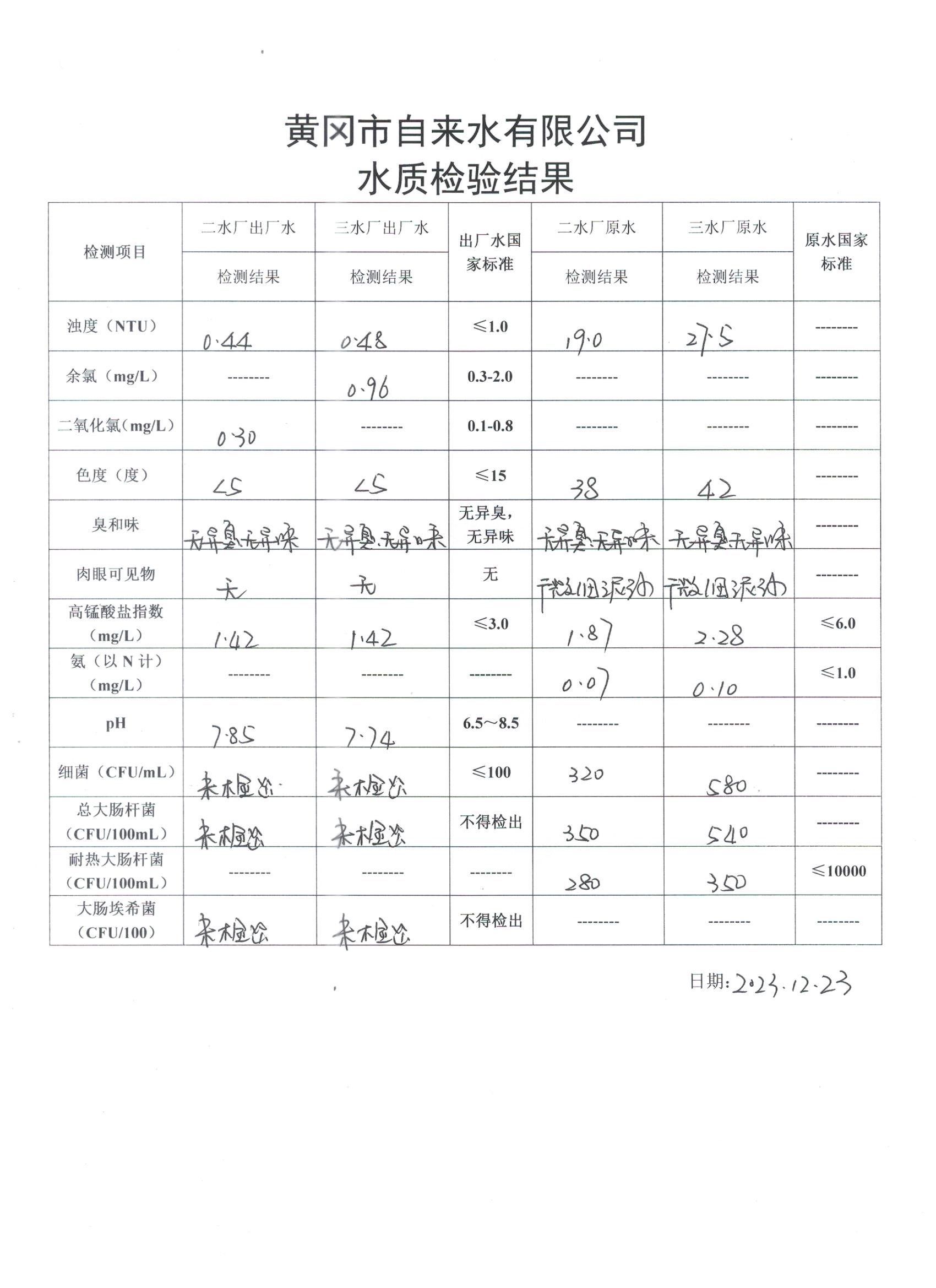 2023年12月23日水質(zhì)檢驗(yàn)日報(bào)表