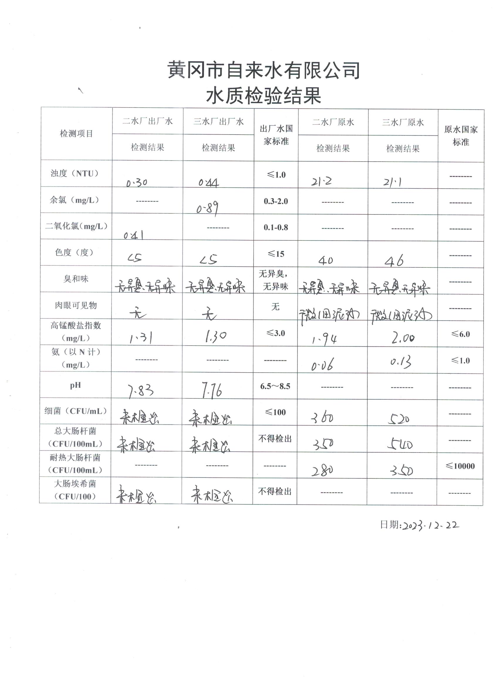 2023年12月22日水質(zhì)檢驗(yàn)日?qǐng)?bào)表