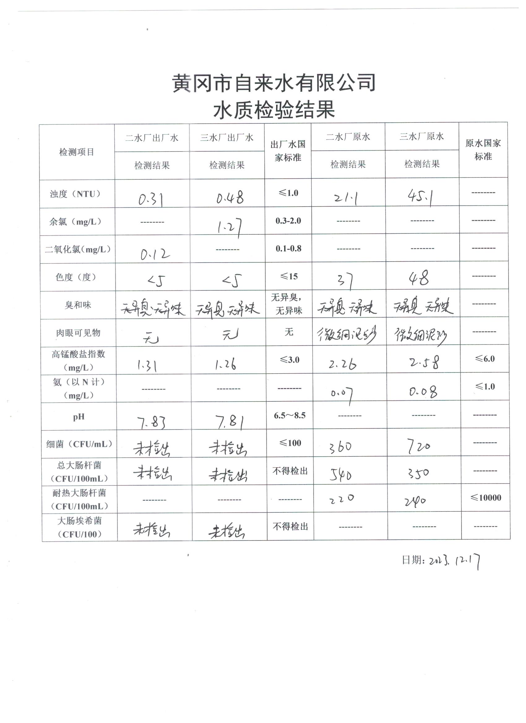 2023年12月17日水質(zhì)檢驗日報表