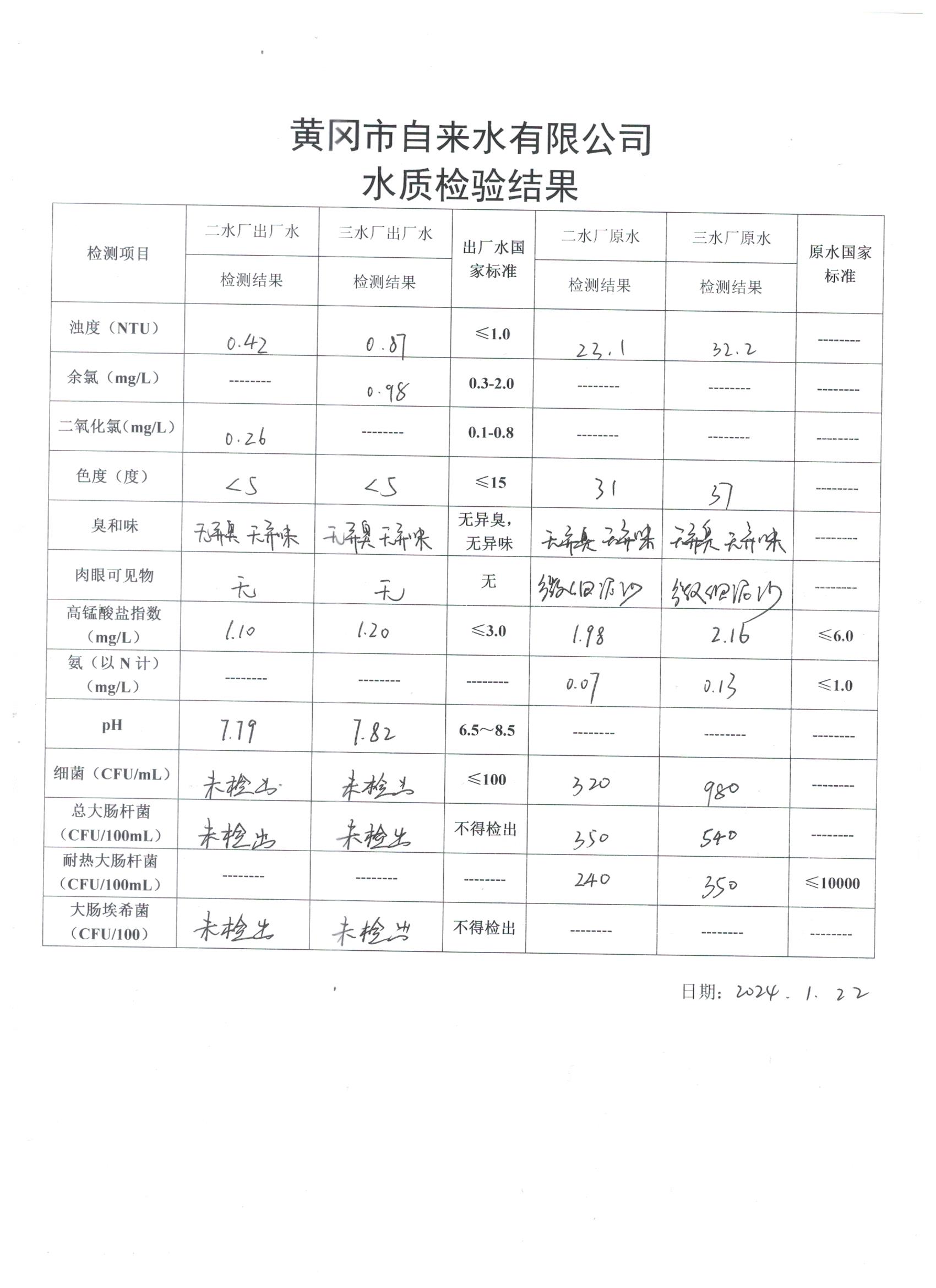 2024年1月22日水質(zhì)檢驗(yàn)日報(bào)表