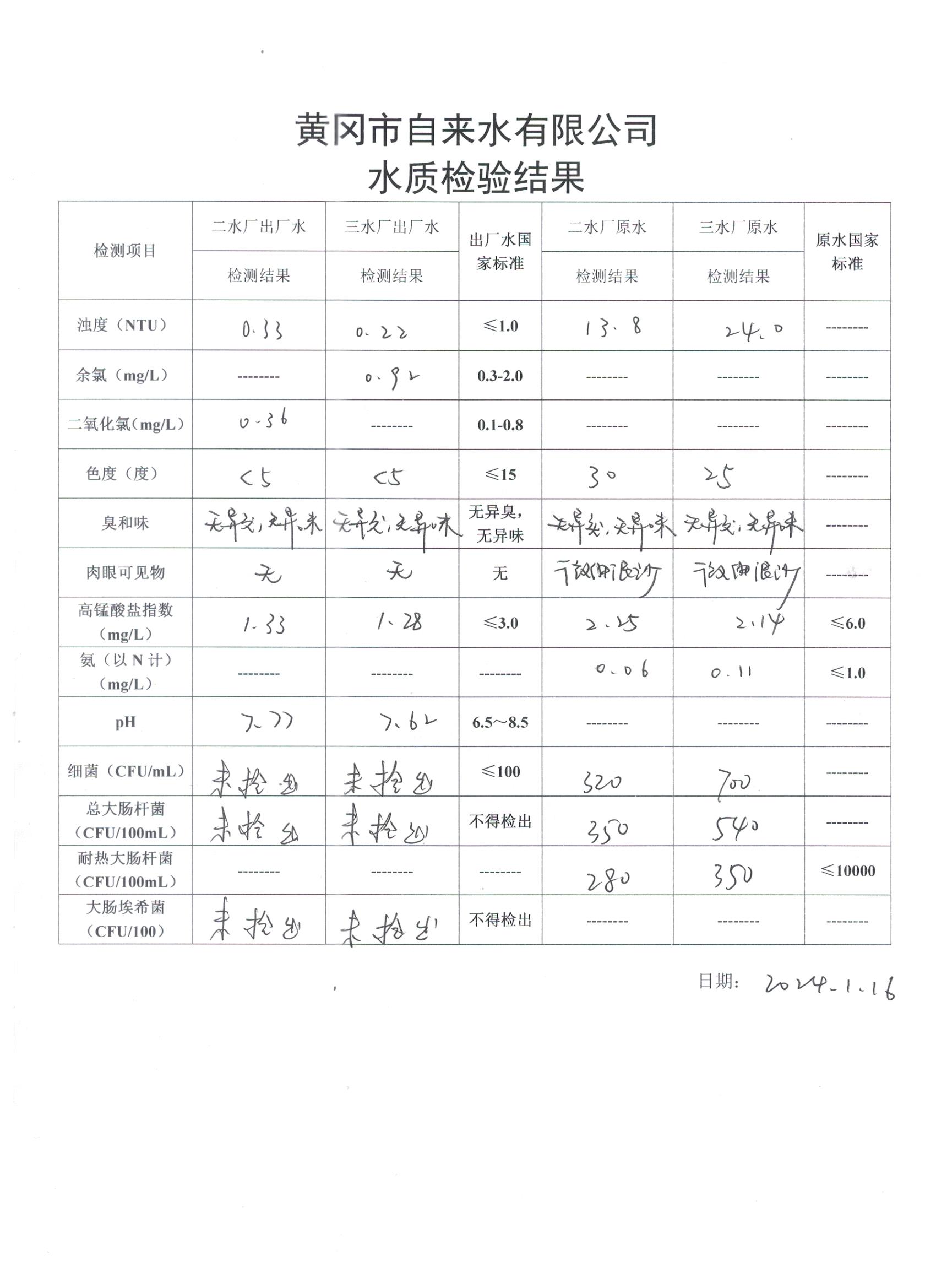 2024年1月16日水質(zhì)檢驗(yàn)日?qǐng)?bào)表