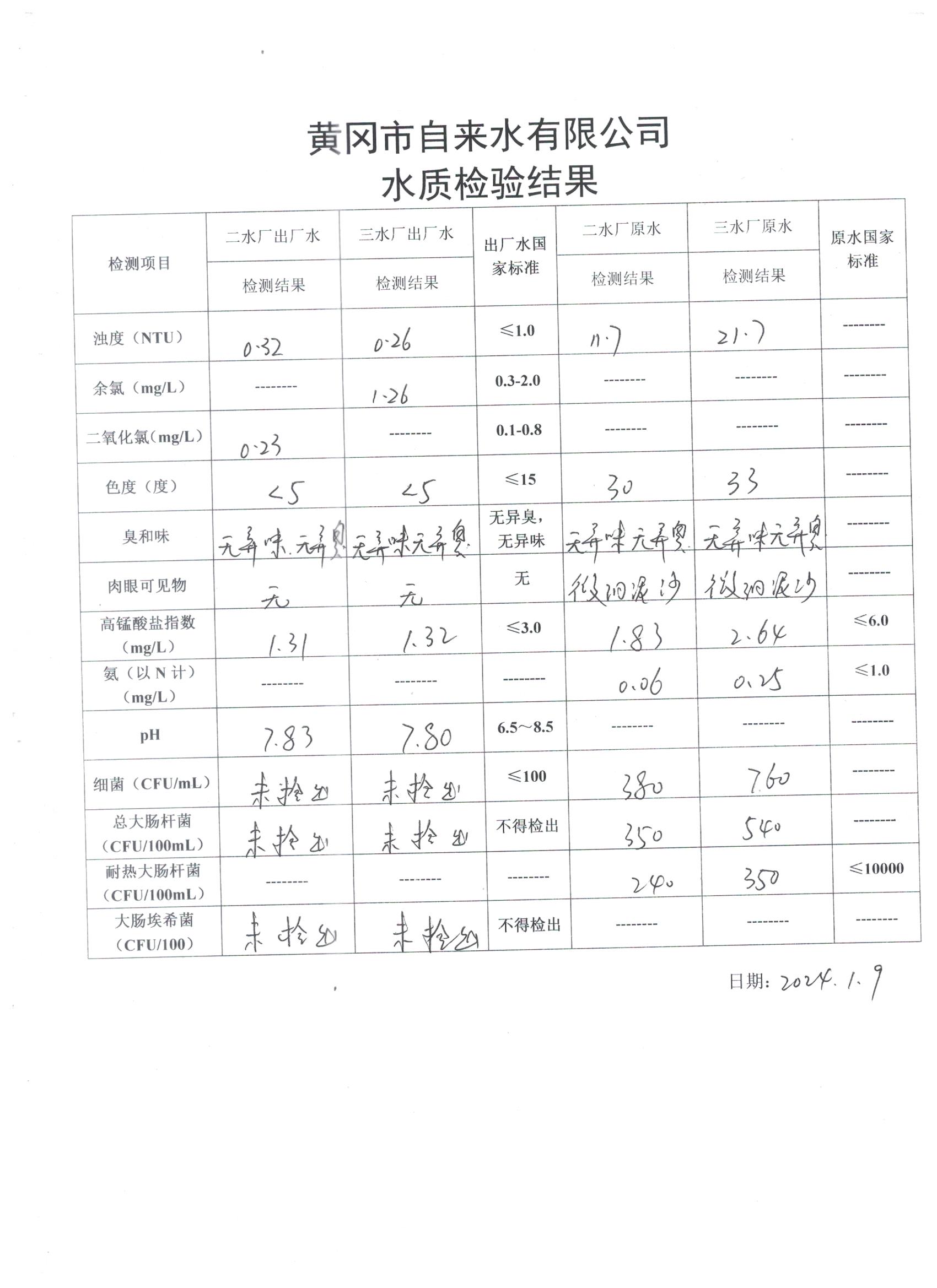 2024年1月9日水質(zhì)檢驗(yàn)日?qǐng)?bào)表