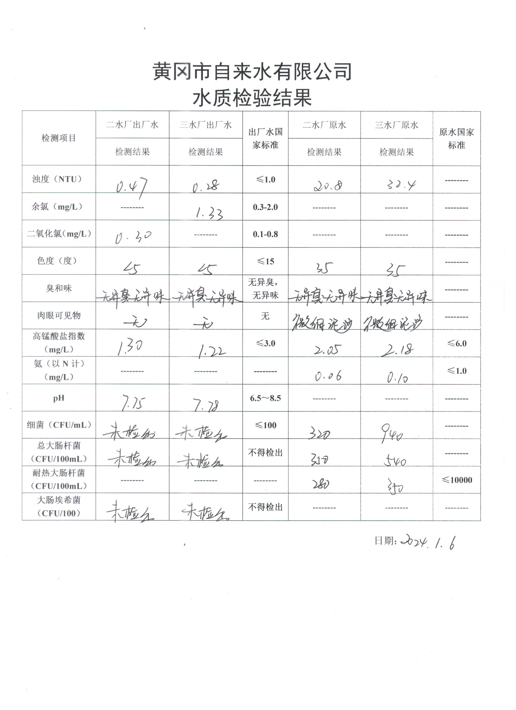 2024年1月6日水質(zhì)檢驗(yàn)日?qǐng)?bào)表