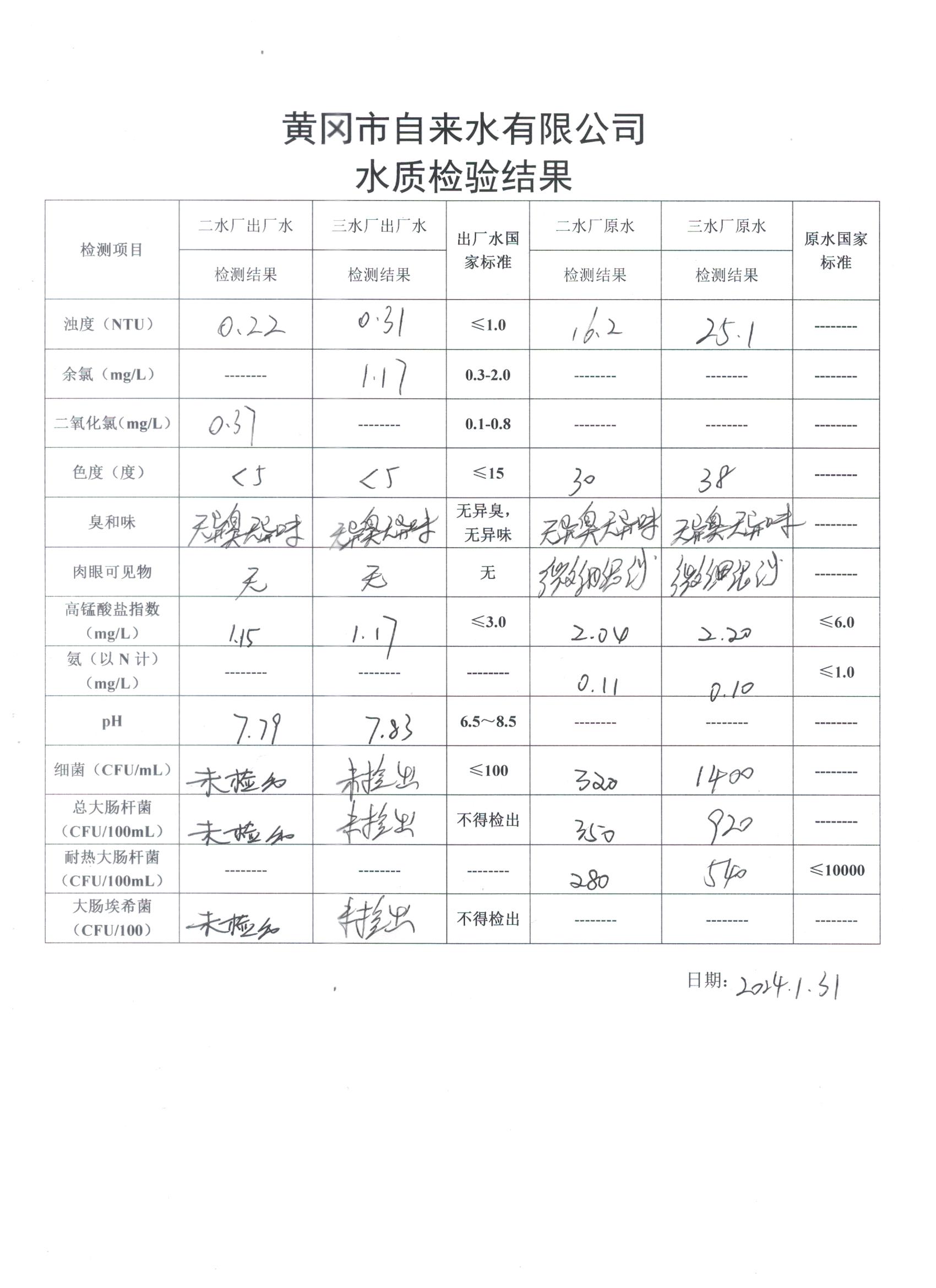 2024年1月31日水質(zhì)檢驗(yàn)日?qǐng)?bào)表