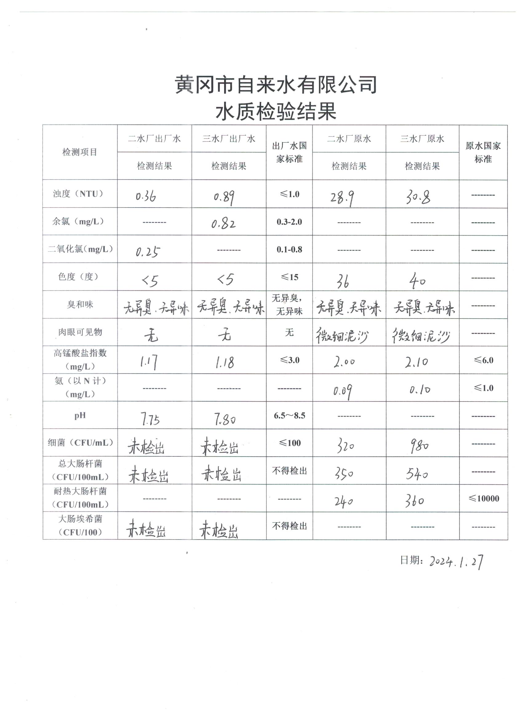 2024年1月27日水質(zhì)檢驗(yàn)日?qǐng)?bào)表