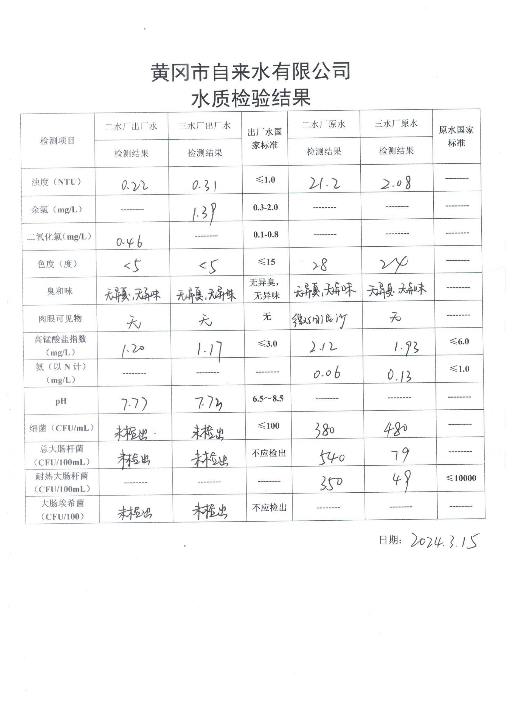 2024年3月15日水質(zhì)檢驗(yàn)日?qǐng)?bào)表