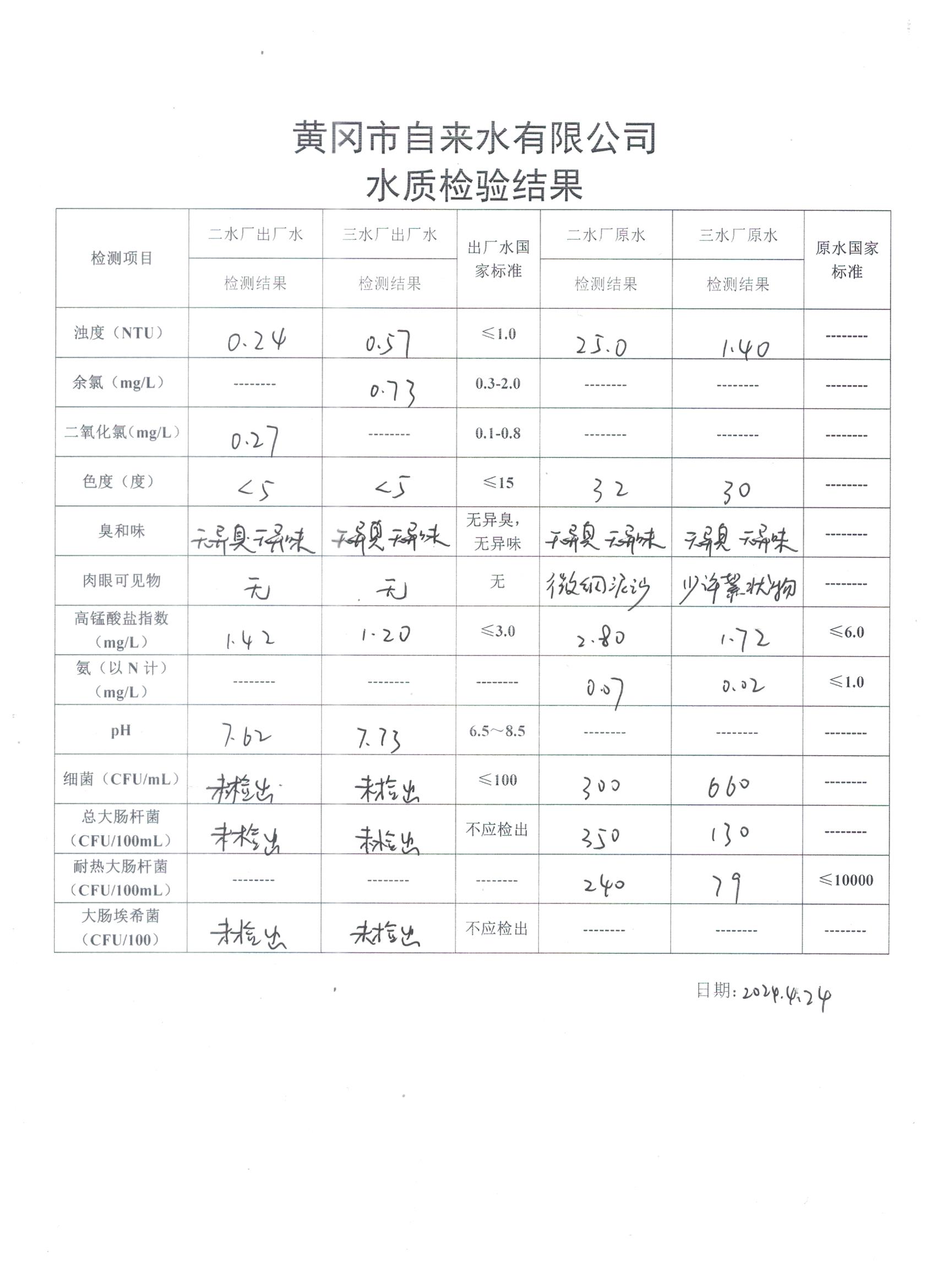 2024年4月24日水質(zhì)檢驗(yàn)日報(bào)表