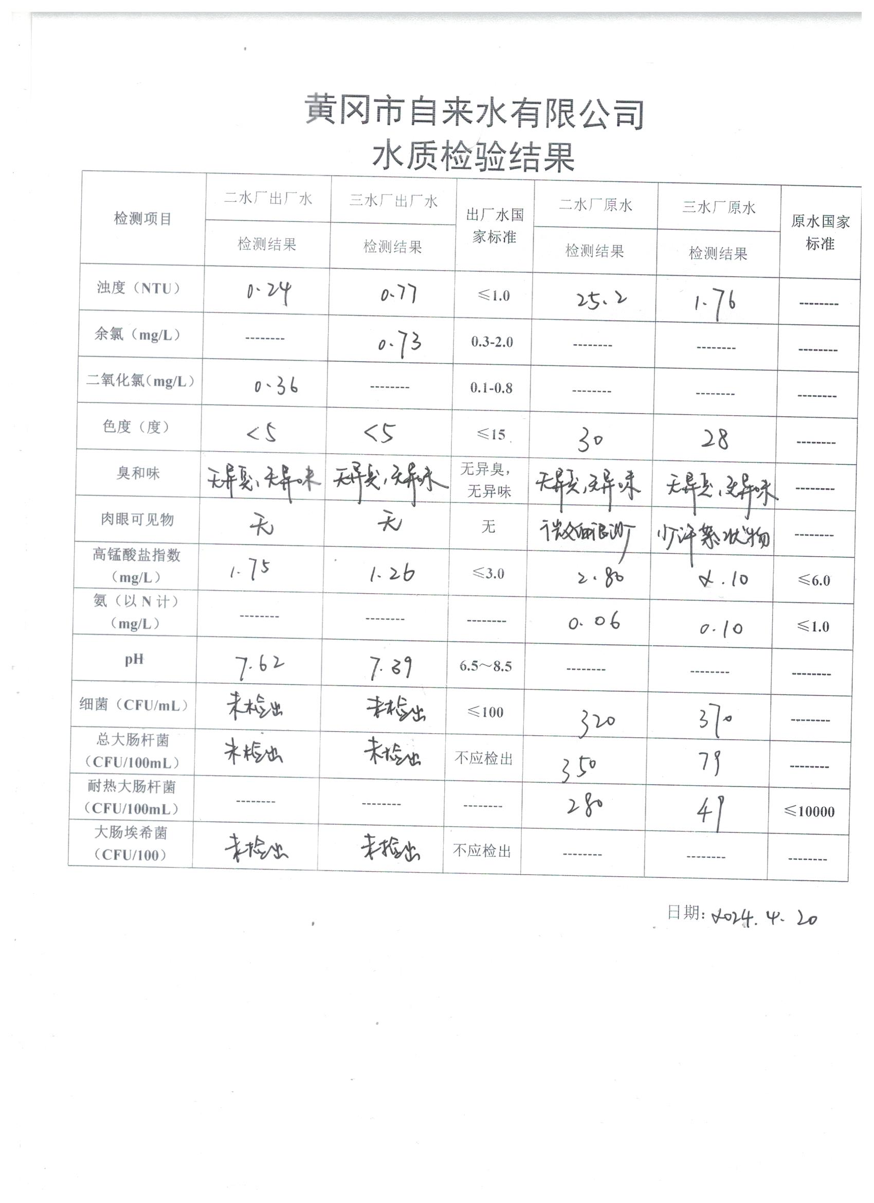 2024年4月20日水質(zhì)檢驗(yàn)日?qǐng)?bào)表
