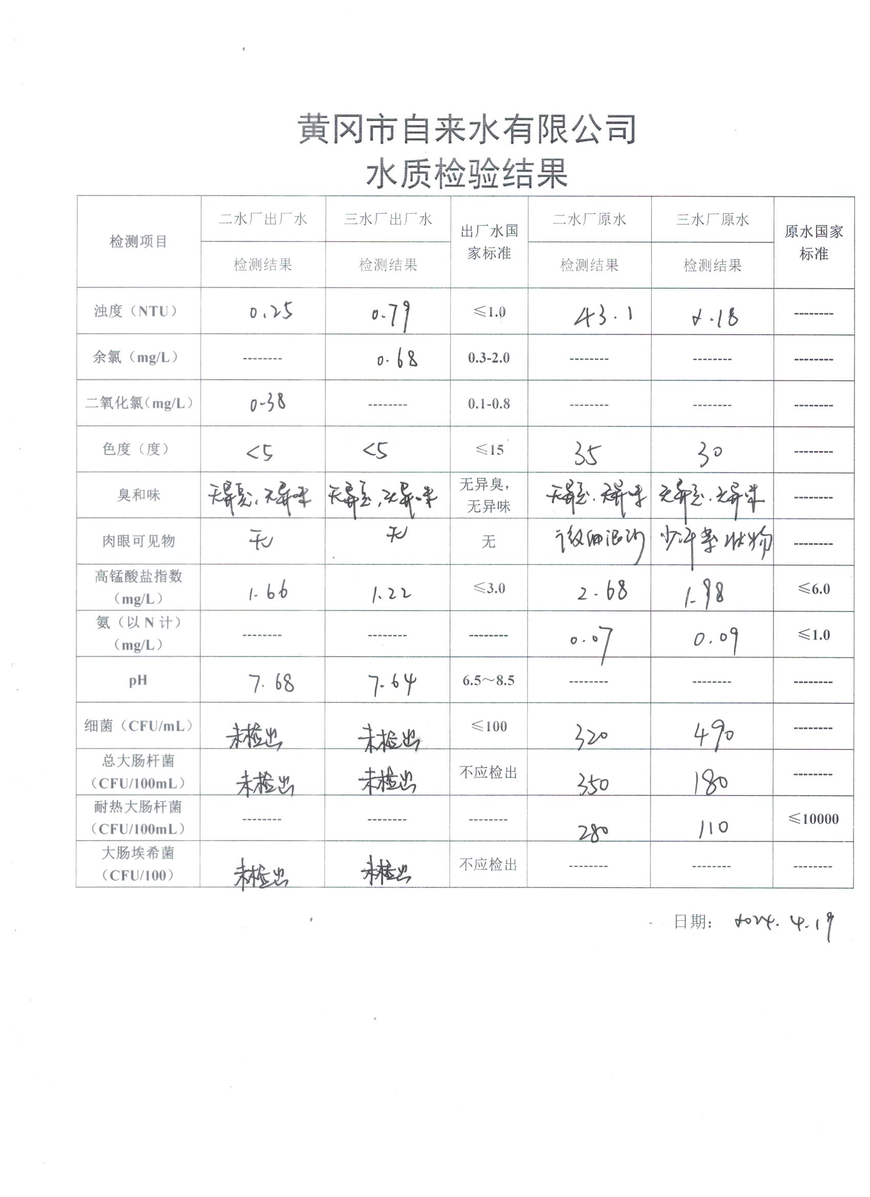 2024年4月19日水質(zhì)檢驗(yàn)日?qǐng)?bào)表