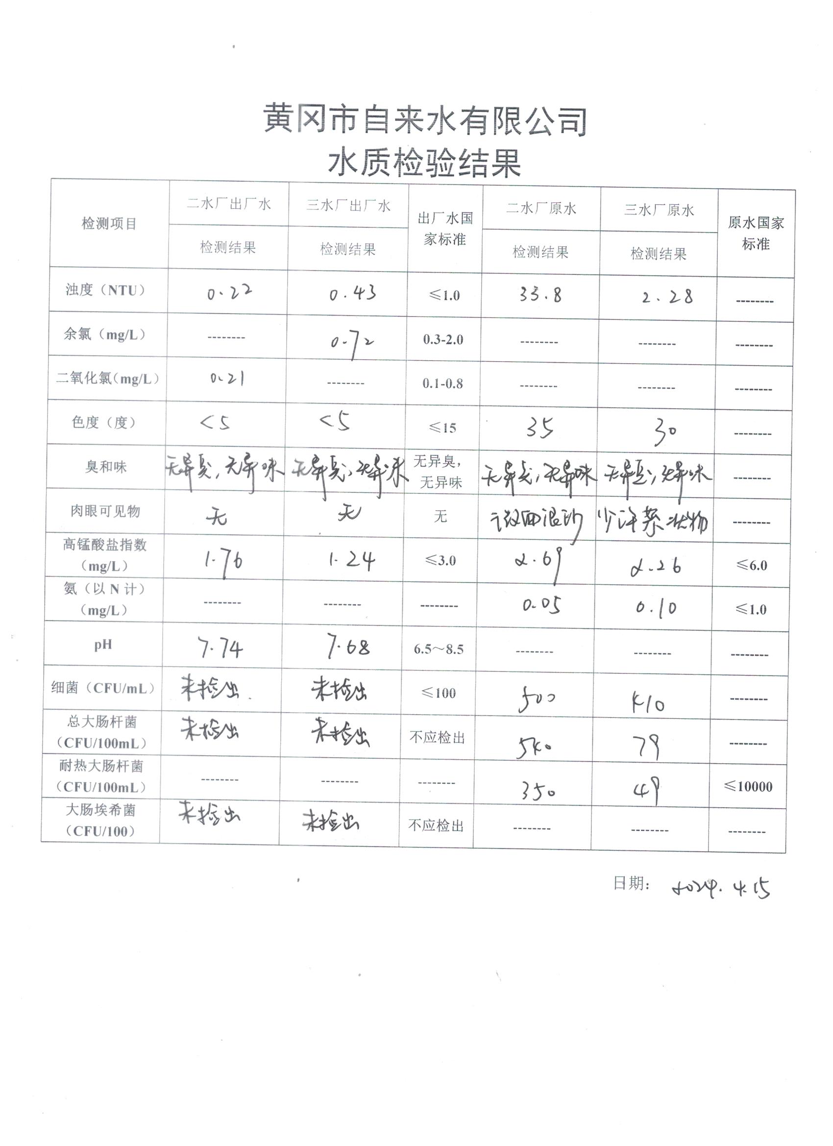 2024年4月15日水質(zhì)檢驗日報表