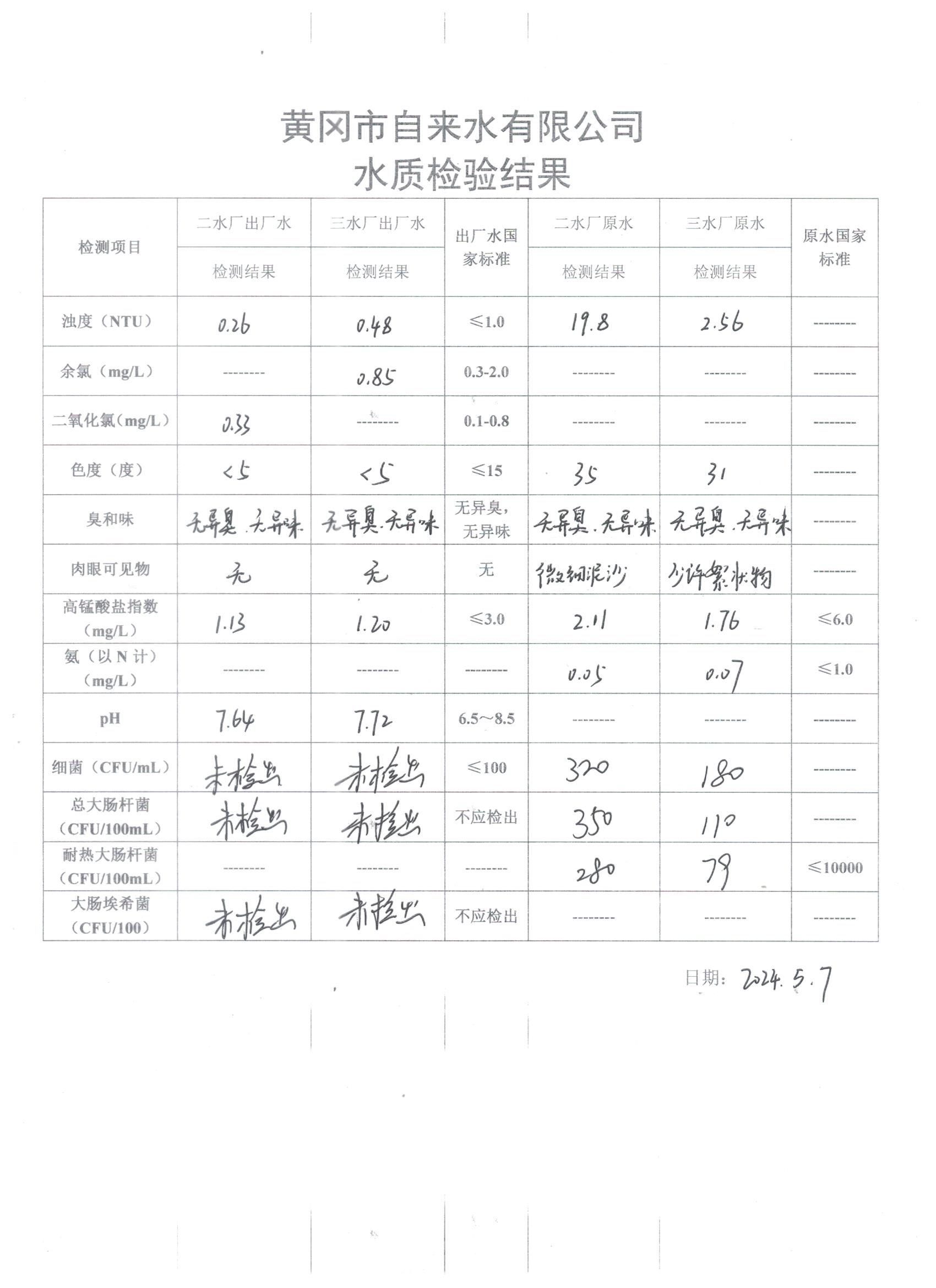2024年5月7日水質(zhì)檢驗日報表