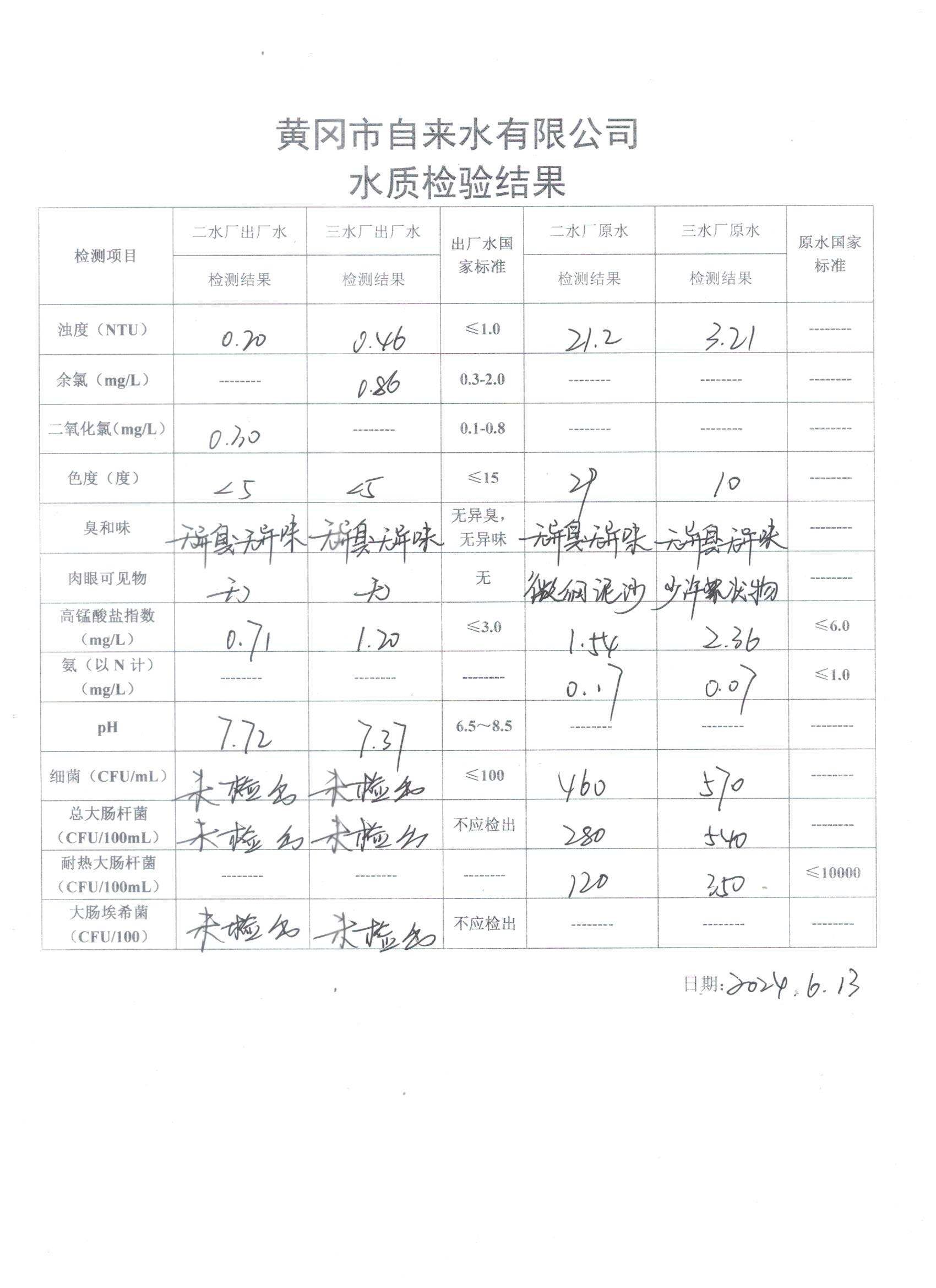 2024年6月13日水質(zhì)檢驗日報表