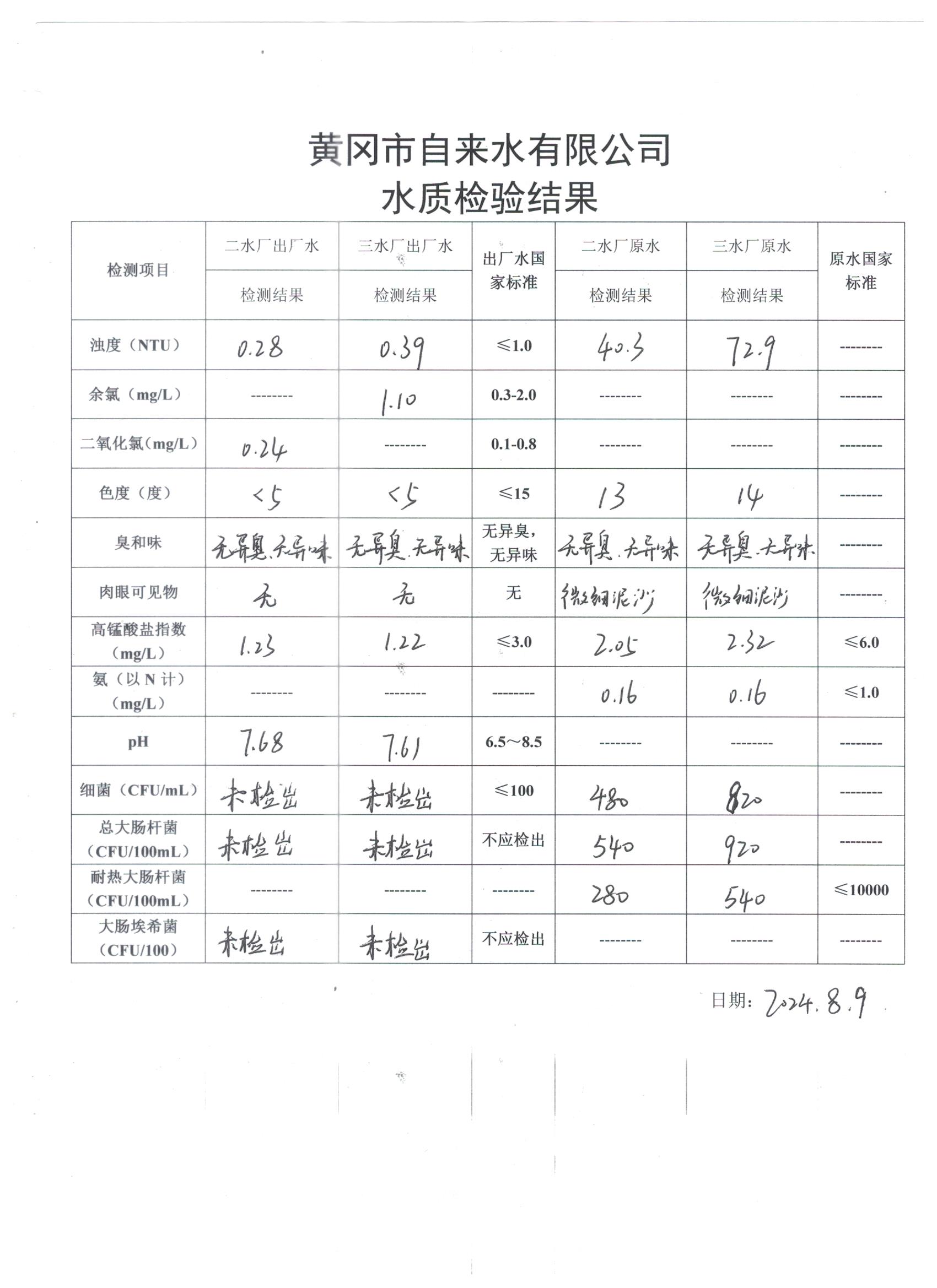2024年8月9日水質(zhì)檢測(cè)日?qǐng)?bào)表