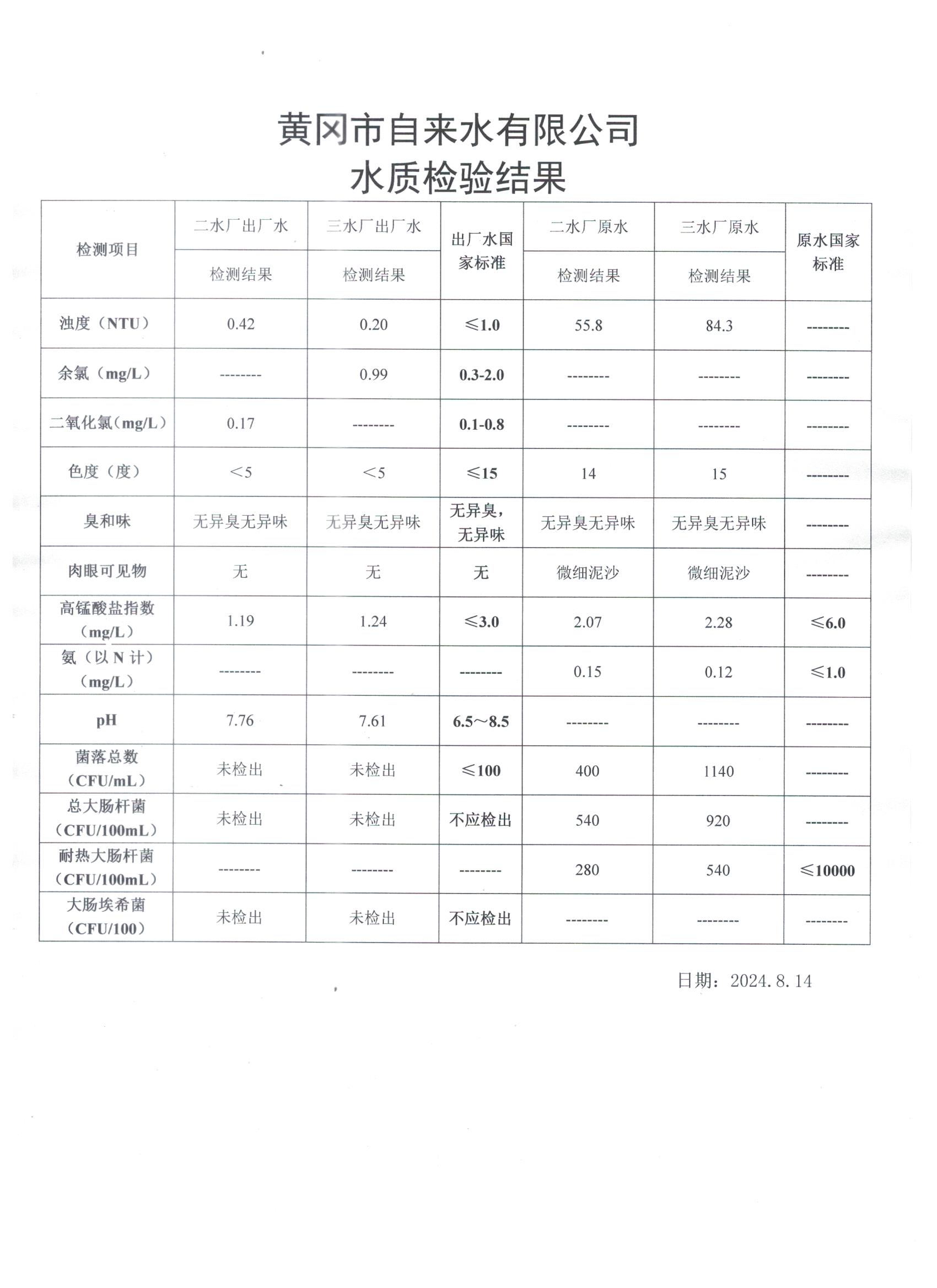 2024年8月14日水質檢測日報表