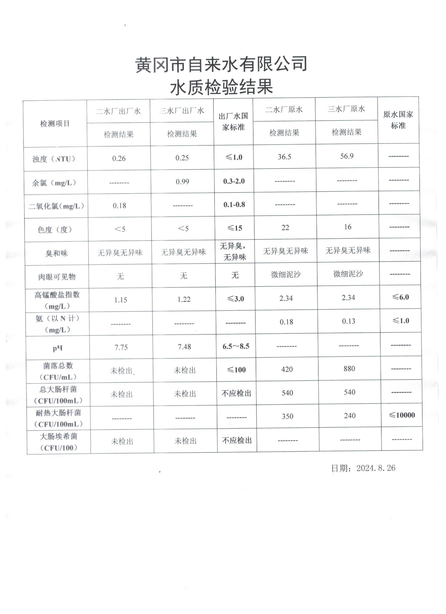 2024年8月26日水質(zhì)檢測日報表